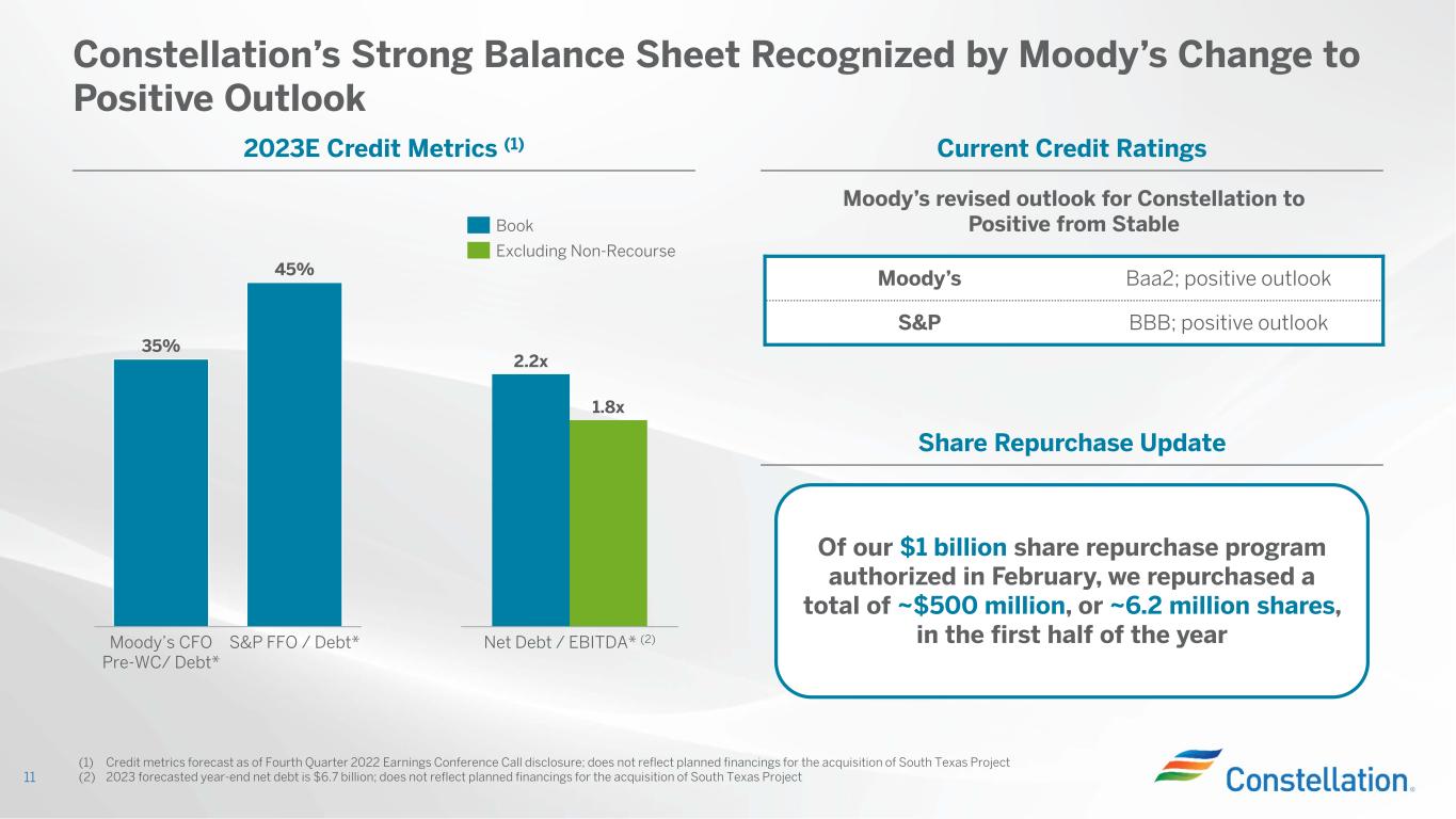 Raising Full-Year Adjusted EBITDA* Guidance Midpoint by $400M 10 Raising full-year Adjusted EBITDA* guidance range to $3,300M - $3,700M • Commercial business outperforming plan in a volatile market – Strong wholesale and retail performance with margin expansion and load auction wins – Successful optimization of the portfolio to capture benefits from volatility – Margin shaping favorability driven by flattening of power curve • Revenue recognition of Illinois ZEC • Performance benefit from Winter Storm Elliott Revised Guidance $3,300 Original Guidance $3,700 $2,900 $3,300 ($M) $3,500 $3,100