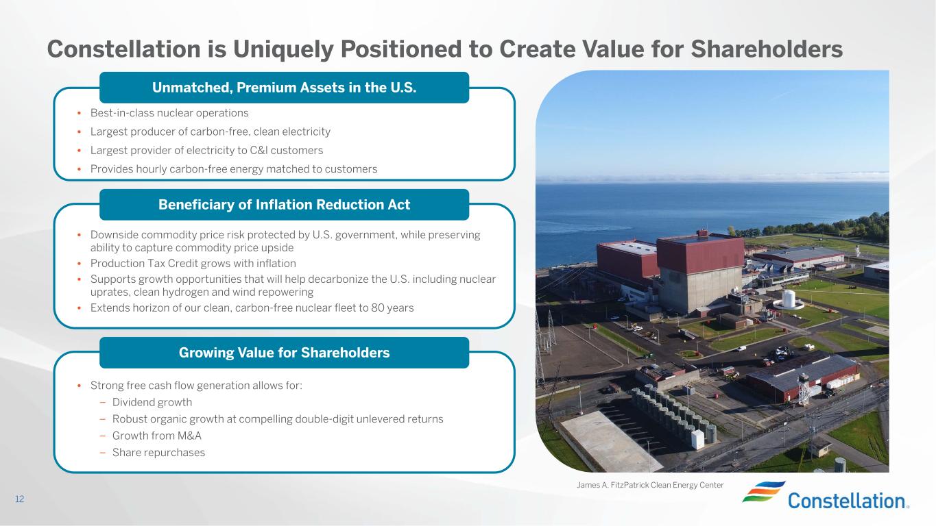 Constellation’s Strong Balance Sheet Recognized by Moody’s Change to Positive Outlook 11 35% 45% Moody’s CFO Pre-WC/ Debt* S&P FFO / Debt* Net Debt / EBITDA* (2) 2.2x 1.8x Book Excluding Non-Recourse (1) Credit metrics forecast as of Fourth Quarter 2022 Earnings Conference Call disclosure; does not reflect planned financings for the acquisition of South Texas Project (2) 2023 forecasted year-end net debt is $6.7 billion; does not reflect planned financings for the acquisition of South Texas Project 2023E Credit Metrics (1) Current Credit Ratings Moody’s Baa2; positive outlook S&P BBB; positive outlook Share Repurchase Update Of our $1 billion share repurchase program authorized in February, we repurchased a total of ~$500 million, or ~6.2 million shares, in the first half of the year Moody’s revised outlook for Constellation to Positive from Stable