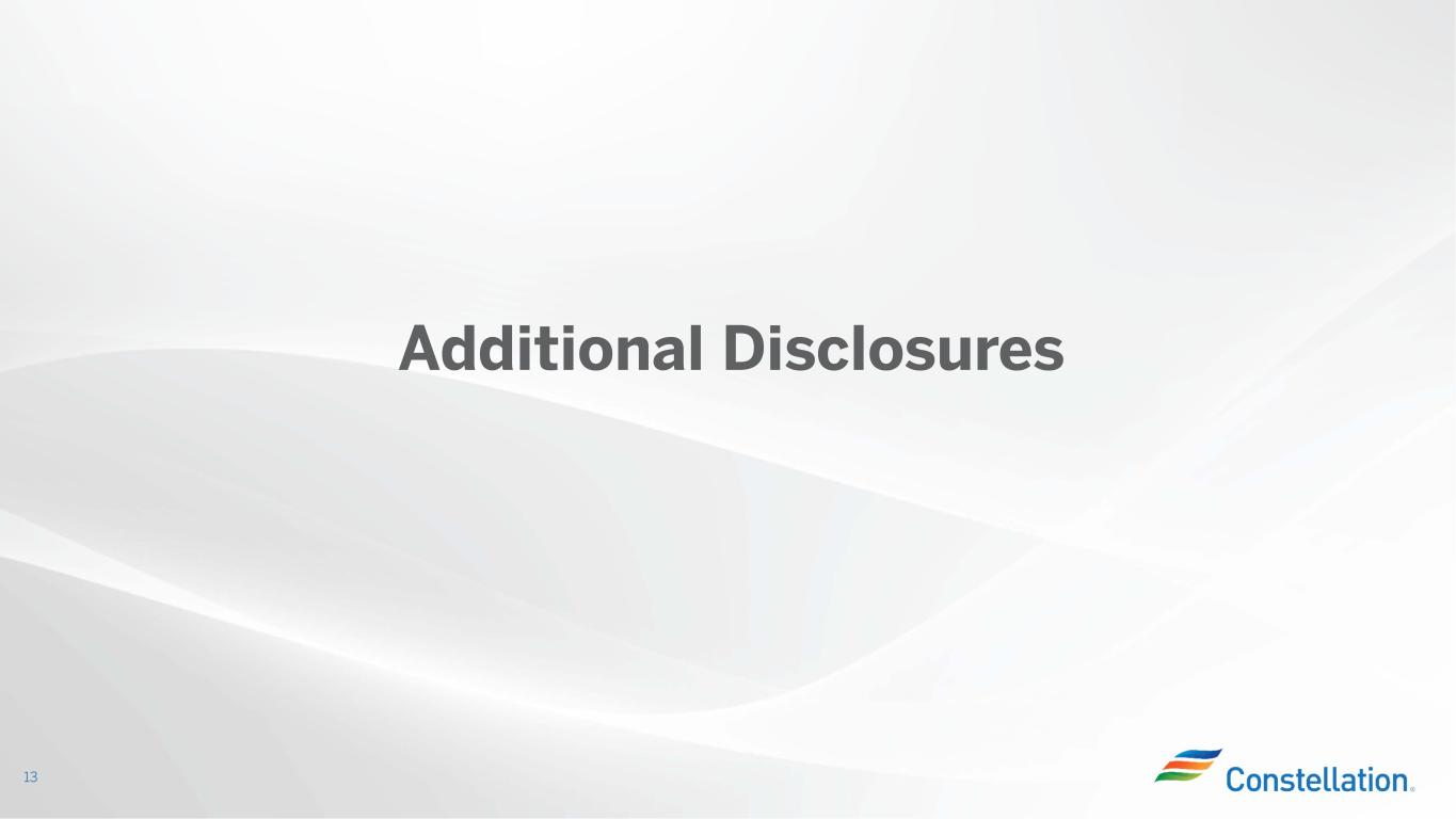 Constellation is Uniquely Positioned to Create Value for Shareholders 12 • Best-in-class nuclear operations • Largest producer of carbon-free, clean electricity • Largest provider of electricity to C&I customers • Provides hourly carbon-free energy matched to customers Unmatched, Premium Assets in the U.S. • Downside commodity price risk protected by U.S. government, while preserving ability to capture commodity price upside • Production Tax Credit grows with inflation • Supports growth opportunities that will help decarbonize the U.S. including nuclear uprates, clean hydrogen and wind repowering • Extends horizon of our clean, carbon-free nuclear fleet to 80 years Beneficiary of Inflation Reduction Act • Strong free cash flow generation allows for: – Dividend growth – Robust organic growth at compelling double-digit unlevered returns – Growth from M&A – Share repurchases Growing Value for Shareholders James A. FitzPatrick Clean Energy Center