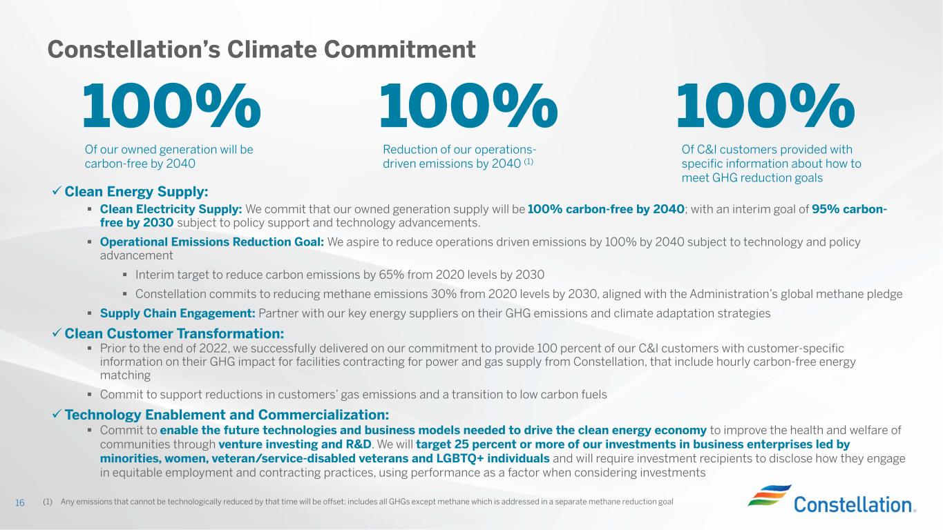 Constellation’s ESG Principles 15 Constellation’s ESG Principles Providing Carbon-Free Energy and Climate Mitigation Commercial & Industrial Customer Transformation Innovation and Technology Enablement Carbon-Free Policy Advocacy Equity and Community Empowerment Commitment to Diversity, Equity and Inclusion Strong Corporate Governance and Risk Management Our Value Proposition and ESG Principles Constellation is positioned to deliver long-term value for our shareholders through our enduring businesses that are ready to meet the climate crisis. We are leading the transition to a carbon-free future as one of the largest providers of energy solutions to commercial and industrial (C&I) customers and the largest producer of carbon-free power in the U.S. Furthermore, our fleet is uniquely situated to be the reliable, baseline carbon- free energy source of the energy transition. We are proud of our history of actively working to reduce our emissions and improving the value, longevity and output of our assets through policy leadership, technology and innovation. Based on this foundation, Constellation is ideally suited to support our customers’ ambitions to reduce their environmental impact and seek solutions to the climate crisis. Our disciplined capital allocation strategy supports a strong investment grade balance sheet, reinvestment in our business, growth investment consistent with our corporate strategy and return of capital to owners. Our ESG principles are core to our business strategy and value proposition. Our values and ESG principles guide us in our central purpose. We are focused on driving action in these critical focus areas: