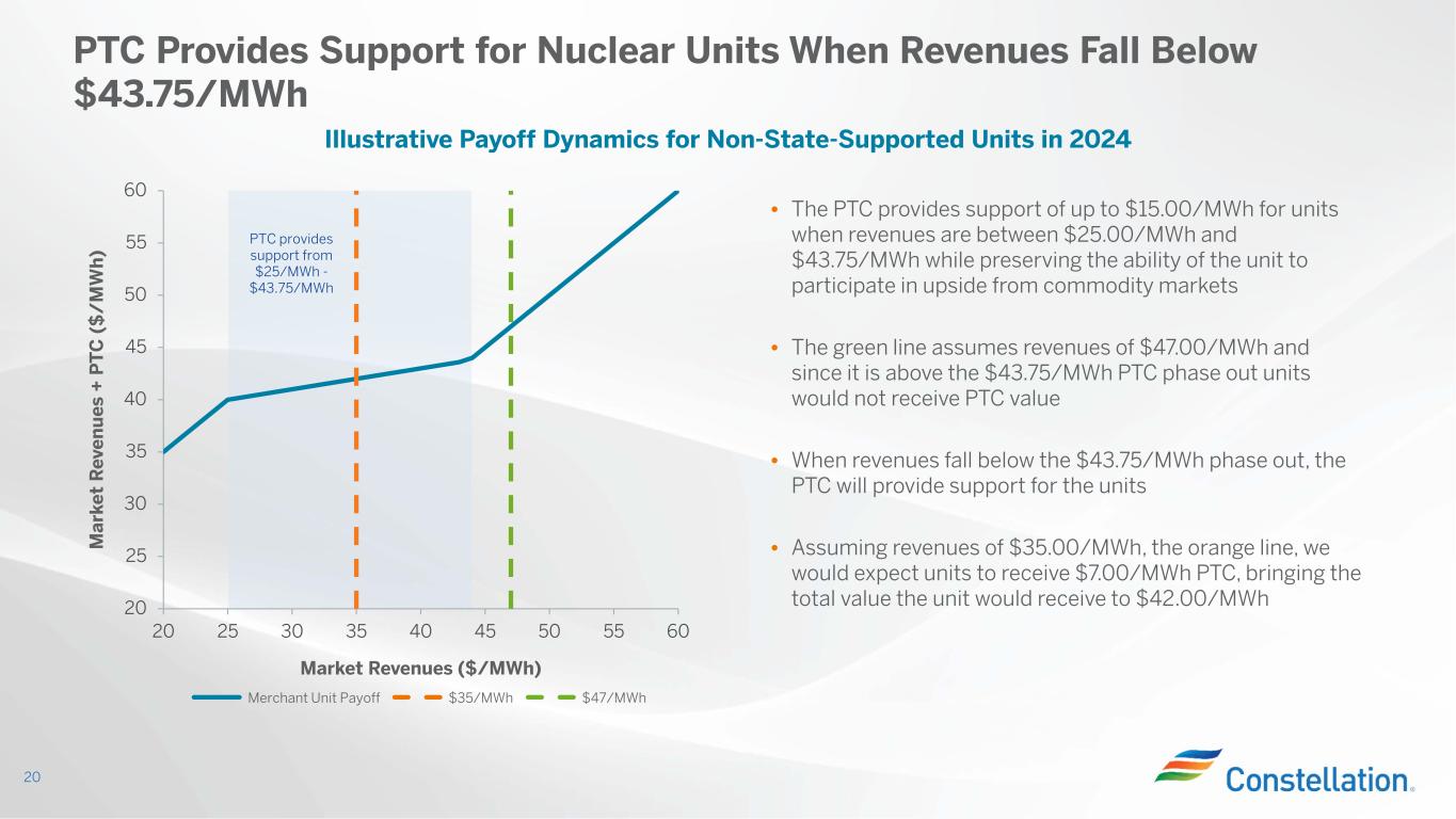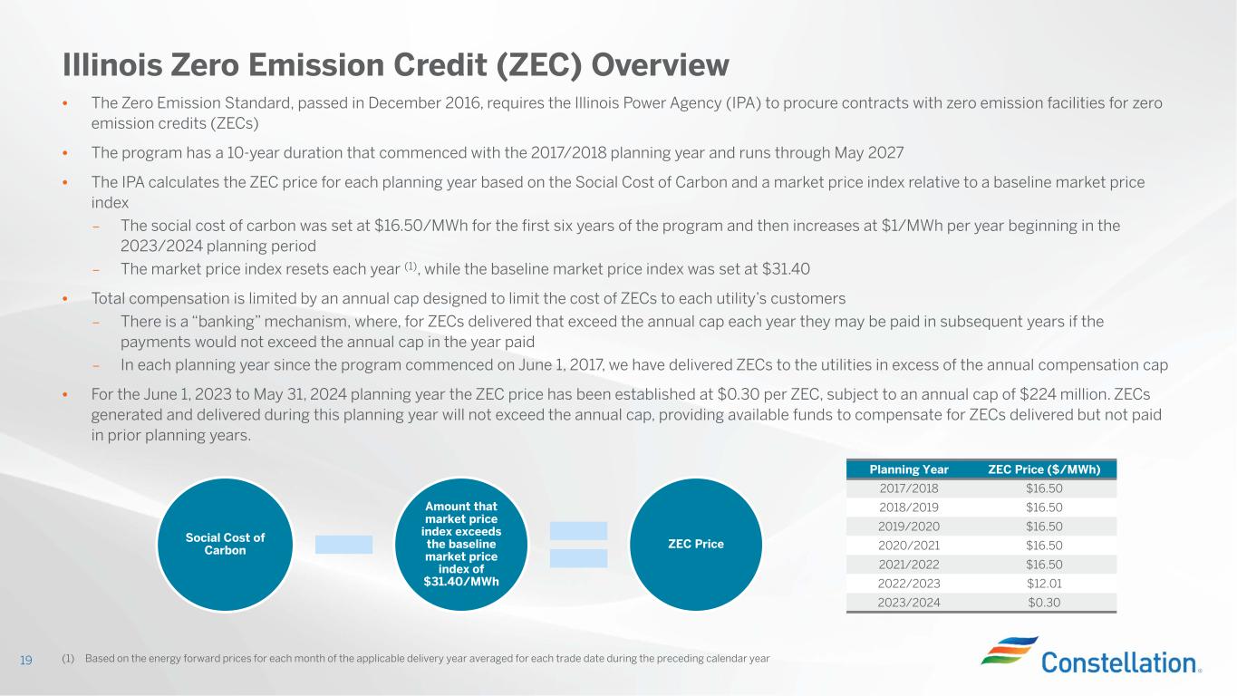 • The Zero Emission Standard, passed in December 2016, requires the Illinois Power Agency (IPA) to procure contracts with zero emission facilities for zero emission credits (ZECs) • The program has a 10-year duration that commenced with the 2017/2018 planning year and runs through May 2027 • The IPA calculates the ZEC price for each planning year based on the Social Cost of Carbon and a market price index relative to a baseline market price index – The social cost of carbon was set at $16.50/MWh for the first six years of the program and then increases at $1/MWh per year beginning in the 2023/2024 planning period – The market price index resets each year (1), while the baseline market price index was set at $31.40 • Total compensation is limited by an annual cap designed to limit the cost of ZECs to each utility’s customers – There is a “banking” mechanism, where, for ZECs delivered that exceed the annual cap each year they may be paid in subsequent years if the payments would not exceed the annual cap in the year paid – In each planning year since the program commenced on June 1, 2017, we have delivered ZECs to the utilities in excess of the annual compensation cap • For the June 1, 2023 to May 31, 2024 planning year the ZEC price has been established at $0.30 per ZEC, subject to an annual cap of $224 million. ZECs generated and delivered during this planning year will not exceed the annual cap, providing available funds to compensate for ZECs delivered but not paid in prior planning years. Illinois Zero Emission Credit (ZEC) Overview Social Cost of Carbon Amount that market price index exceeds the baseline market price index of $31.40/MWh ZEC Price (1) Based on the energy forward prices for each month of the applicable delivery year averaged for each trade date during the preceding calendar year19 Planning Year ZEC Price ($/MWh) 2017/2018 $16.50 2018/2019 $16.50 2019/2020 $16.50 2020/2021 $16.50 2021/2022 $16.50 2022/2023 $12.01 2023/2024 $0.30