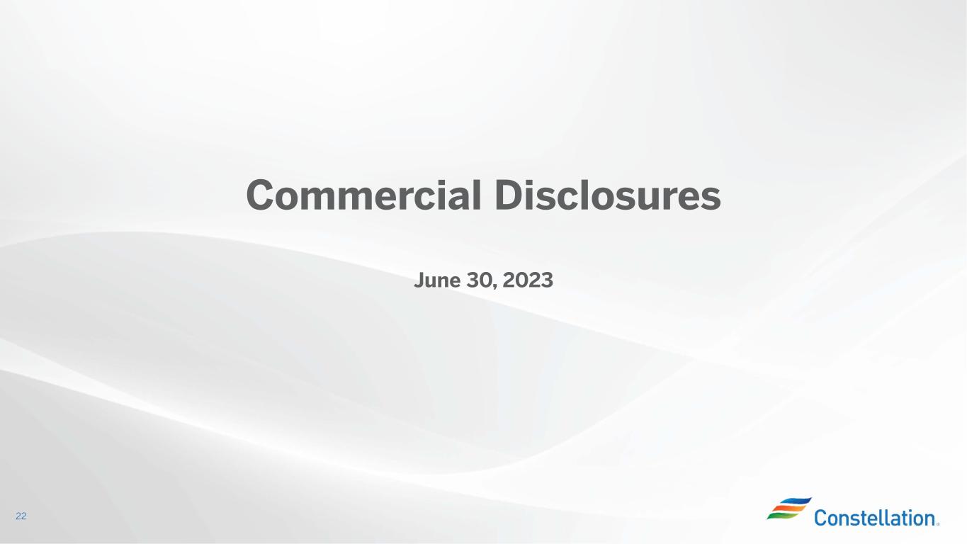 Maximum PTC Gross Receipts Threshold Power Price At Which PTC=$0 Maximum PTC Gross Receipts Threshold Power Price At Which PTC=$0 Maximum PTC Gross Receipts Threshold Power Price At Which PTC=$0 2024 15.00$ 25.00$ 43.75$ 15.00$ 25.00$ 43.75$ 15.00$ 25.00$ 43.75$ 2025 15.00$ 26.00$ 44.75$ 15.00$ 26.00$ 44.75$ 15.00$ 26.00$ 44.75$ 2026 15.00$ 26.00$ 44.75$ 15.00$ 27.00$ 45.75$ 15.00$ 27.00$ 45.75$ 2027 15.00$ 27.00$ 45.75$ 17.50$ 27.00$ 48.88$ 17.50$ 28.00$ 49.88$ 2028 15.00$ 27.00$ 45.75$ 17.50$ 28.00$ 49.88$ 17.50$ 29.00$ 50.88$ 2029 17.50$ 28.00$ 49.88$ 17.50$ 29.00$ 50.88$ 17.50$ 30.00$ 51.88$ 2030 17.50$ 28.00$ 49.88$ 17.50$ 30.00$ 51.88$ 20.00$ 32.00$ 57.00$ 2031 17.50$ 29.00$ 50.88$ 17.50$ 31.00$ 52.88$ 20.00$ 33.00$ 58.00$ 2032 17.50$ 29.00$ 50.88$ 20.00$ 32.00$ 57.00$ 20.00$ 34.00$ 59.00$ 2% Inflation 3% Inflation 4% Inflation • Starting in 2025, the maximum PTC and gross receipts threshold are subject to an inflation adjustment based on the GDP price deflator for the preceding calendar year: • Maximum PTC is rounded to nearest $2.50/MWh and gross receipts threshold is rounded to nearest $1.00/MWh Inflation of Nuclear Production Tax Credit (PTC) (1) 21 (1) See H.R. 5376 for additional details; all numbers assume that prevailing wage requirements are satisfied (2) Annual inflation adjustment is consistent with past published guidance for renewable energy credits, published annually PTC Overview Example Assuming 2%, 3% and 4% Inflation (2) Inflation Adjustment= GDP price deflator in preceeding year GDP price deflator in 2023 PTC Inflation Adjustment • The PTC is in effect beginning after 12/31/23 and through 12/31/32 • In the base year 2024, Constellation qualifies for the nuclear PTC up to $15.00/MWh; the PTC amount is reduced by 80% of gross receipts exceeding $25.00/MWh, phasing out completely after $43.75/MWh • The nuclear PTC can be credited against taxes or monetized through sale to an unrelated taxpayer