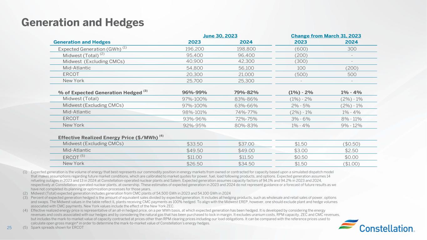 Gross Margin Category ($M) (1) 2023 2024 2023 2024 Open Gross Margin (including South, West, New England & Canada hedged GM)* $4,550 $5,400 $50 ($150) Contracted Revenues (Capacity, ZEC and IL CMC Plant Revenues) (2) $2,950 $2,750 $100 - Mark-to-Market of Hedges (3) $800 $50 $350 $250 Power New Business / To Go $100 $200 ($100) ($100) Non-Power Margins Executed $350 $300 - - Non-Power New Business / To Go $50 $250 ($50) - Total Gross Margin* (4) $8,800 $8,950 $350 - Nuclear PTC Value for Plants Not Supported By State Programs (4,5) N/A $250 N/A $150 Total Gross Margin* + PTC (4,5) $8,800 $9,200 $350 $150 Reference Prices (4) 2023 2024 2023 2024 Henry Hub Natural Gas ($/MMBtu) $2.69 $3.52 ($0.04) ($0.11) Midwest: NiHub ATC prices ($/MWh) $28.03 $36.75 ($3.05) ($3.76) Mid-Atlantic: PJM-W ATC prices ($/MWh) $34.07 $43.95 ($2.36) ($3.38) ERCOT-N ATC Spark Spread ($/MWh) HSC Gas, 7.2HR, $2.50 VOM $23.89 $18.06 $7.92 $2.73 New York: NY Zone A ($/MWh) $27.18 $37.38 ($0.29) $0.73 June 30, 2023 Change from March 31, 2023 Gross Margin* 24 (1) Gross margin* categories rounded to nearest $50M (2) Includes gross margin* and CMC payments for CMC plants (3) Mark-to-Market of Hedges assumes mid-point of hedge percentages (4) Based on June 30, 2023, market conditions (5) Plants included in PTC value are Calvert Cliffs, LaSalle, Limerick and Peach Bottom