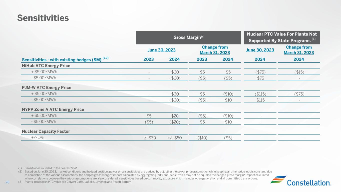 Generation and Hedges 2023 2024 2023 2024 Expected Generation (GWh) (1) 196,200 198,800 (600) 300 Midwest (Total) (2) 95,400 96,400 (200) - Midwest (Excluding CMCs) 40,900 42,300 (300) - Mid-Atlantic 54,800 56,100 100 (200) ERCOT 20,300 21,000 (500) 500 New York 25,700 25,300 - - % of Expected Generation Hedged (3) 96%-99% 79%-82% (1%) - 2% 1% - 4% Midwest (Total) 97%-100% 83%-86% (1%) - 2% (2%) - 1% Midwest (Excluding CMCs) 97%-100% 63%-66% 2% - 5% (2%) - 1% Mid-Atlantic 98%-101% 74%-77% (2%) - 1% 1% - 4% ERCOT 93%-96% 72%-75% 3% - 6% 8% - 11% New York 92%-95% 80%-83% 1% - 4% 9% - 12% Effective Realized Energy Price ($/MWh) (4) Midwest (Excluding CMCs) $33.50 $37.00 $1.50 ($0.50) Mid-Atlantic $49.50 $49.00 $3.00 $2.50 ERCOT (5) $11.00 $11.50 $0.50 $0.00 New York $26.50 $34.50 $1.50 ($1.00) June 30, 2023 Change from March 31, 2023 25 (1) Expected generation is the volume of energy that best represents our commodity position in energy markets from owned or contracted for capacity based upon a simulated dispatch model that makes assumptions regarding future market conditions, which are calibrated to market quotes for power, fuel, load following products, and options. Expected generation assumes 14 refueling outages in 2023 and 13 in 2024 at Constellation-operated nuclear plants and Salem. Expected generation assumes capacity factors of 94.1% and 94.2% in 2023 and 2024, respectively at Constellation-operated nuclear plants, at ownership. These estimates of expected generation in 2023 and 2024 do not represent guidance or a forecast of future results as we have not completed its planning or optimization processes for those years. (2) Midwest (Total) expected generation includes generation from CMC plants of 54,500 GWh in 2023 and 54,100 GWh in 2024 (3) Percent of expected generation hedged is the amount of equivalent sales divided by expected generation. It includes all hedging products, such as wholesale and retail sales of power, options and swaps. The Midwest values in the table reflect IL plants receiving CMC payments as 100% hedged. To align with the Midwest EREP, however, one should exclude plant and hedge volumes associated with CMC payments. New York values include the effect of the New York ZEC. (4) Effective realized energy price is representative of an all-in hedged price, on a per MWh basis, at which expected generation has been hedged. It is developed by considering the energy revenues and costs associated with our hedges and by considering the natural gas that has been purchased to lock in margin. It excludes uranium costs, RPM capacity, ZEC and CMC revenues, but includes the mark-to-market value of capacity contracted at prices other than RPM clearing prices including our load obligations. It can be compared with the reference prices used to calculate open gross margin* in order to determine the mark-to-market value of Constellation’s energy hedges. (5) Spark spreads shown for ERCOT Generation and Hedges