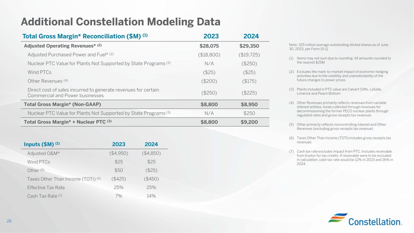Row Item Midwest (Excl. CMCs) (2) Mid-Atlantic ERCOT (3) New York (A) Start with fleet-wide open gross margin* (B) Contracted Revenues (C) Expected Generation (TWh) 42.3 56.1 21 25.3 (D) Hedge % (assuming mid-point of range) 64.5% 75.5% 73.5% 81.5% (E=C*D) Hedged Volume (TWh) 27.3 42.4 15.4 20.6 (F) Effective Realized Energy Price ($/MWh) $37.00 $49.00 $11.50 $34.50 (G) Reference Price ($/MWh) $36.75 $43.95 $18.06 $37.38 (H=F-G) Difference ($/MWh) $0.25 $5.05 ($6.56) ($2.88) (I=E*H) Mark-to-Market value of hedges ($ million) (1) $5 $215 ($100) ($60) (J=A+B+I) Hedged Gross Margin* ($ million) (K) Power New Business / To Go ($ million) (L) Non-Power Margins Executed ($ million) (M) Non-Power New Business / To Go ($ million) (N=J+K+L+M) Total Gross Margin * (O) Nuclear PTC Value For Plants Not Supported By State Programs (4) (P=N+O) Total Gross Margin* + Nuclear PTC (4) $9,200 million $300 $250 $8,950 million $5.4 billion $8,200 $200 $2.75 billion $250 Illustrative Example of Modeling 2024 Total Gross Margin* 27 (1) Mark-to-market rounded to the nearest $5M (2) Uses the Midwest hedge ratio that excludes the CMC plant volume and hedges (3) Spark spreads shown for ERCOT (4) Plants included in PTC value are Calvert Cliffs, LaSalle, Limerick and Peach Bottom