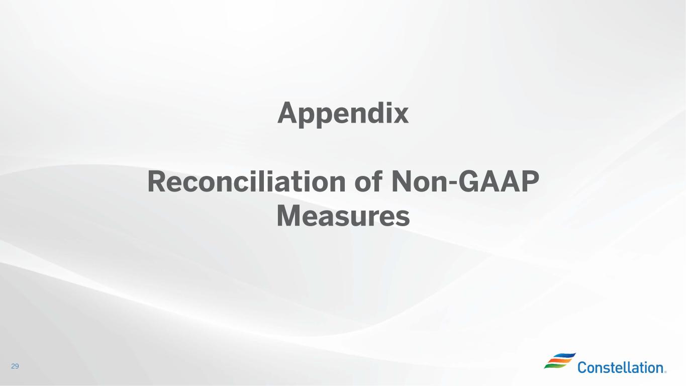 Additional Constellation Modeling Data 28 Total Gross Margin* Reconciliation ($M) (1) 2023 2024 Adjusted Operating Revenues* (2) $28,075 $29,350 Adjusted Purchased Power and Fuel* (2) ($18,800) ($19,725) Nuclear PTC Value for Plants Not Supported by State Programs (3) N/A ($250) Wind PTCs ($25) ($25) Other Revenues (4) ($200) ($175) Direct cost of sales incurred to generate revenues for certain Commercial and Power businesses ($250) ($225) Total Gross Margin* (Non-GAAP) $8,800 $8,950 Nuclear PTC Value for Plants Not Supported by State Programs (3) N/A $250 Total Gross Margin* + Nuclear PTC (3) $8,800 $9,200 Note: 325 million average outstanding diluted shares as of June 30, 2023, per Form 10-Q (1) Items may not sum due to rounding. All amounts rounded to the nearest $25M (2) Excludes the mark-to-market impact of economic hedging activities due to the volatility and unpredictability of the future changes to power prices (3) Plants included in PTC value are Calvert Cliffs, LaSalle, Limerick and Peach Bottom (4) Other Revenues primarily reflects revenues from variable interest entities, funds collected through revenues for decommissioning the former PECO nuclear plants through regulated rates and gross receipts tax revenues (5) Other primarily reflects noncontrolling interest and Other Revenues (excluding gross receipts tax revenue) (6) Taxes Other Than Income (TOTI) includes gross receipts tax revenues (7) Cash tax rate excludes impact from PTC. Includes receivable from Exelon for tax credits. If receivable were to be excluded in calculation, cash tax rate would be 12% in 2023 and 26% in 2024. Inputs ($M) (1) 2023 2024 Adjusted O&M* ($4,950) ($4,850) Wind PTCs $25 $25 Other (5) $50 ($25) Taxes Other Than Income (TOTI) (6) ($425) ($450) Effective Tax Rate 25% 25% Cash Tax Rate (7) 7% 14%