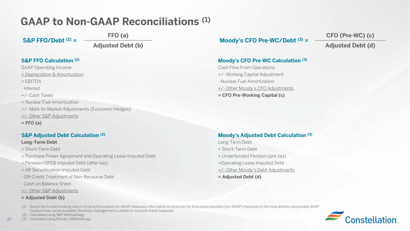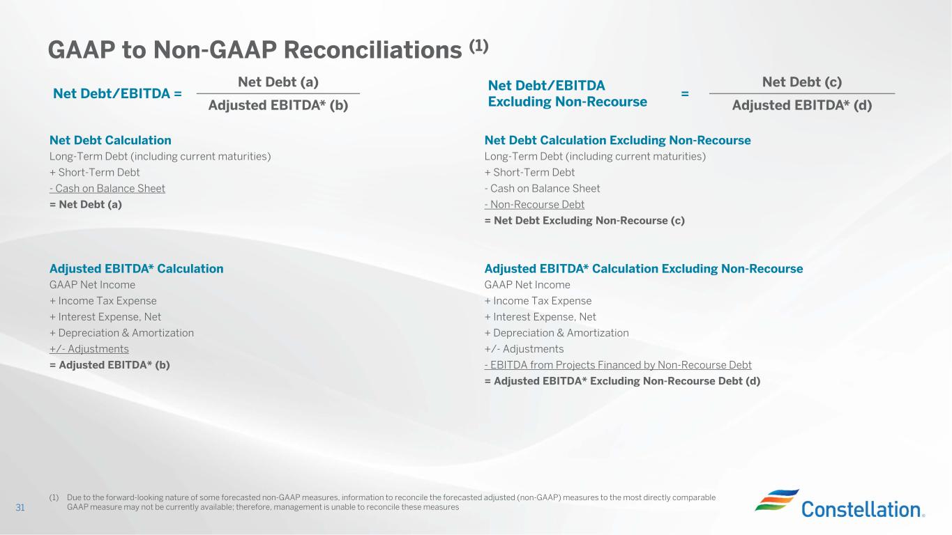 S&P FFO/Debt (2) = FFO (a) Moody’s CFO Pre-WC/Debt (3) = CFO (Pre-WC) (c) Adjusted Debt (b) Adjusted Debt (d) S&P FFO Calculation (2) Moody’s CFO Pre-WC Calculation (3) GAAP Operating Income Cash Flow From Operations + Depreciation & Amortization +/- Working Capital Adjustment = EBITDA - Nuclear Fuel Amortization - Interest +/- Other Moody’s CFO Adjustments +/- Cash Taxes = CFO Pre-Working Capital (c) + Nuclear Fuel Amortization +/- Mark-to-Market Adjustments (Economic Hedges) +/- Other S&P Adjustments = FFO (a) S&P Adjusted Debt Calculation (2) Moody’s Adjusted Debt Calculation (3) Long-Term Debt Long-Term Debt + Short-Term Debt + Short-Term Debt + Purchase Power Agreement and Operating Lease Imputed Debt + Underfunded Pension (pre-tax) + Pension/OPEB Imputed Debt (after-tax) +Operating Lease Imputed Debt + AR Securitization Imputed Debt +/- Other Moody’s Debt Adjustments - Off-Credit Treatment of Non-Recourse Debt = Adjusted Debt (d) - Cash on Balance Sheet +/- Other S&P Adjustments = Adjusted Debt (b) GAAP to Non-GAAP Reconciliations (1) 30 (1) Due to the forward-looking nature of some forecasted non-GAAP measures, information to reconcile the forecasted adjusted (non-GAAP) measures to the most directly comparable GAAP measure may not be available; therefore, management is unable to reconcile these measures (2) Calculated using S&P Methodology (3) Calculated using Moody’s Methodology