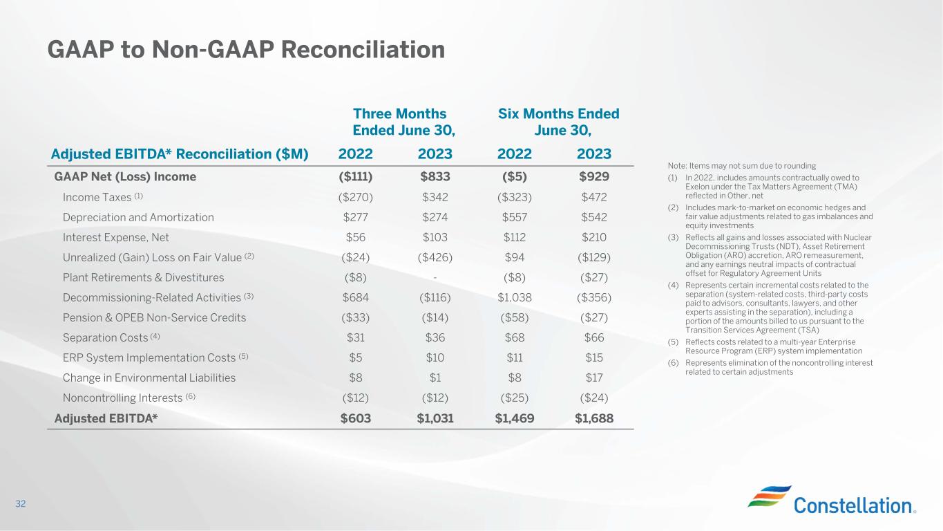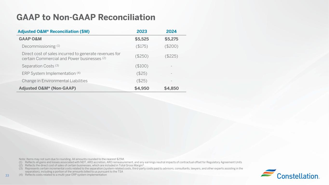 Three Months Ended June 30, Six Months Ended June 30, Adjusted EBITDA* Reconciliation ($M) 2022 2023 2022 2023 GAAP Net (Loss) Income ($111) $833 ($5) $929 Income Taxes (1) ($270) $342 ($323) $472 Depreciation and Amortization $277 $274 $557 $542 Interest Expense, Net $56 $103 $112 $210 Unrealized (Gain) Loss on Fair Value (2) ($24) ($426) $94 ($129) Plant Retirements & Divestitures ($8) - ($8) ($27) Decommissioning-Related Activities (3) $684 ($116) $1,038 ($356) Pension & OPEB Non-Service Credits ($33) ($14) ($58) ($27) Separation Costs (4) $31 $36 $68 $66 ERP System Implementation Costs (5) $5 $10 $11 $15 Change in Environmental Liabilities $8 $1 $8 $17 Noncontrolling Interests (6) ($12) ($12) ($25) ($24) Adjusted EBITDA* $603 $1,031 $1,469 $1,688 GAAP to Non-GAAP Reconciliation 32 Note: Items may not sum due to rounding (1) In 2022, includes amounts contractually owed to Exelon under the Tax Matters Agreement (TMA) reflected in Other, net (2) Includes mark-to-market on economic hedges and fair value adjustments related to gas imbalances and equity investments (3) Reflects all gains and losses associated with Nuclear Decommissioning Trusts (NDT), Asset Retirement Obligation (ARO) accretion, ARO remeasurement, and any earnings neutral impacts of contractual offset for Regulatory Agreement Units (4) Represents certain incremental costs related to the separation (system-related costs, third-party costs paid to advisors, consultants, lawyers, and other experts assisting in the separation), including a portion of the amounts billed to us pursuant to the Transition Services Agreement (TSA) (5) Reflects costs related to a multi-year Enterprise Resource Program (ERP) system implementation (6) Represents elimination of the noncontrolling interest related to certain adjustments