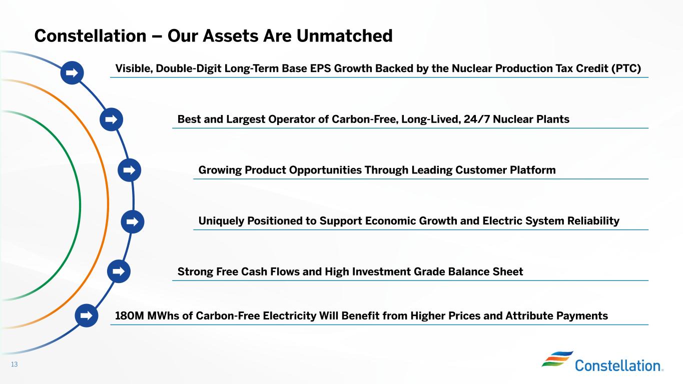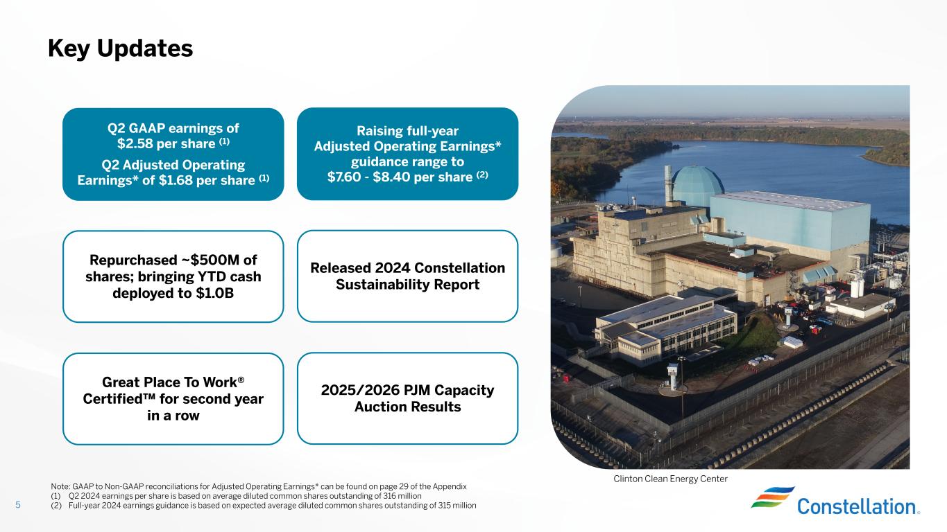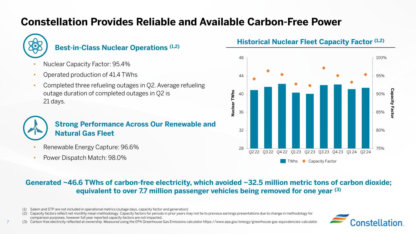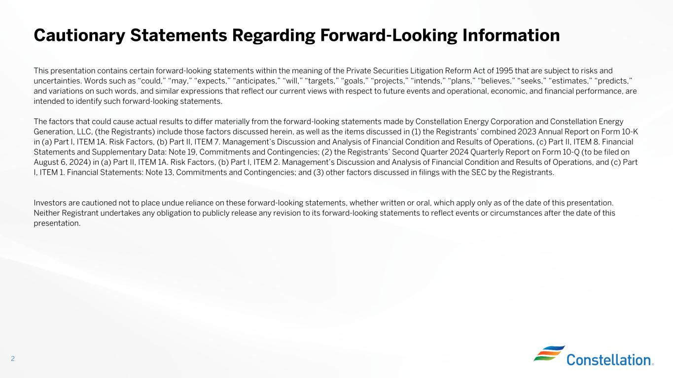 This presentation contains certain forward-looking statements within the meaning of the Private Securities Litigation Reform Act of 1995 that are subject to risks and uncertainties. Words such as “could,” “may,” “expects,” “anticipates,” “will,” “targets,” “goals,” “projects,” “intends,” “plans,” “believes,” “seeks,” “estimates,” “predicts,” and variations on such words, and similar expressions that reflect our current views with respect to future events and operational, economic, and financial performance, are intended to identify such forward-looking statements. The factors that could cause actual results to differ materially from the forward-looking statements made by Constellation Energy Corporation and Constellation Energy Generation, LLC, (the Registrants) include those factors discussed herein, as well as the items discussed in (1) the Registrants’ combined 2023 Annual Report on Form 10-K in (a) Part I, ITEM 1A. Risk Factors, (b) Part II, ITEM 7. Management’s Discussion and Analysis of Financial Condition and Results of Operations, (c) Part II, ITEM 8. Financial Statements and Supplementary Data: Note 19, Commitments and Contingencies; (2) the Registrants’ Second Quarter 2024 Quarterly Report on Form 10-Q (to be filed on August 6, 2024) in (a) Part II, ITEM 1A. Risk Factors, (b) Part I, ITEM 2. Management’s Discussion and Analysis of Financial Condition and Results of Operations, and (c) Part I, ITEM 1. Financial Statements: Note 13, Commitments and Contingencies; and (3) other factors discussed in filings with the SEC by the Registrants. Investors are cautioned not to place undue reliance on these forward-looking statements, whether written or oral, which apply only as of the date of this presentation. Neither Registrant undertakes any obligation to publicly release any revision to its forward-looking statements to reflect events or circumstances after the date of this presentation. Cautionary Statements Regarding Forward-Looking Information 2