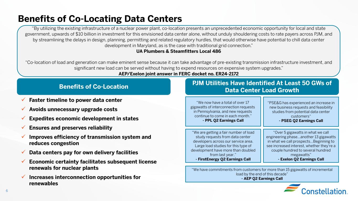 Benefits of Co-Locating Data Centers 6 Benefits of Co-Location PJM Utilities Have Identified At Least 50 GWs of Data Center Load Growth “PSE&G has experienced an increase in new business requests and feasibility studies from potential data center customers“ - PSEG Q2 Earnings Call “We now have a total of over 17 gigawatts of interconnection requests in Pennsylvania, and new requests continue to come in each month.” - PPL Q2 Earnings Call “We are getting a fair number of load study requests from data center developers across our service area. Large load studies for this type of development have more than doubled from last year.” - FirstEnergy Q2 Earnings Call “Over 5 gigawatts in what we call engineering phase…another 13 gigawatts in what we call prospects…Beginning to see increased interest, whether they're a couple hundred to several hundred megawatts” - Exelon Q2 Earnings Call “We have commitments from customers for more than 15 gigawatts of incremental load by the end of this decade” - AEP Q2 Earnings Call  Faster timeline to power data center  Avoids unnecessary upgrade costs  Expedites economic development in states  Ensures and preserves reliability  Improves efficiency of transmission system and reduces congestion  Data centers pay for own delivery facilities  Economic certainty facilitates subsequent license renewals for nuclear plants  Increases interconnection opportunities for renewables “By utilizing the existing infrastructure of a nuclear power plant, co-location presents an unprecedented economic opportunity for local and state government, upwards of $10 billion in investment for this envisioned data center alone, without unduly shouldering costs to rate payers across PJM, and by streamlining the delays in design, planning, permitting and related regulatory hurdles, that would otherwise have potential to chill data center development in Maryland, as is the case with traditional grid connection.” UA Plumbers & Steamfitters Local 486 “Co-location of load and generation can make eminent sense because it can take advantage of pre-existing transmission infrastructure investment, and significant new load can be served without having to expend resources on expensive system upgrades.” AEP/Exelon joint answer in FERC docket no. ER24-2172