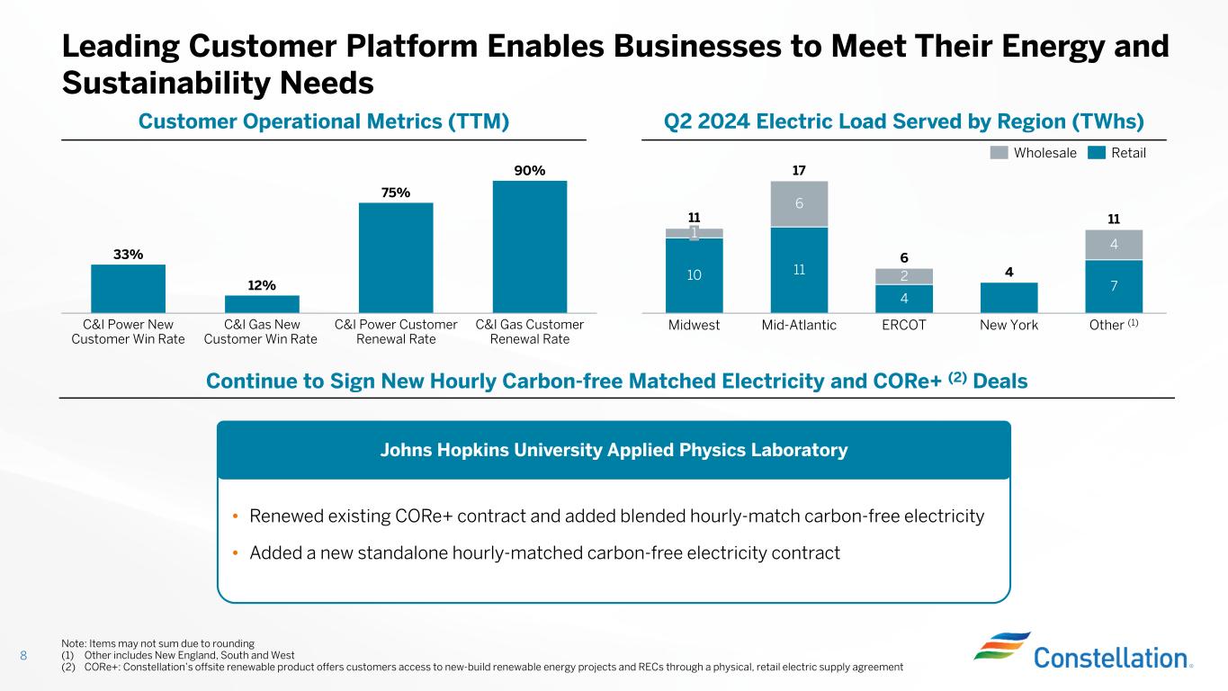 Best-in-Class Nuclear Operations (1,2) • Nuclear Capacity Factor: 95.4% • Operated production of 41.4 TWhs • Completed three refueling outages in Q2. Average refueling outage duration of completed outages in Q2 is 21 days. 7 Constellation Provides Reliable and Available Carbon-Free Power (1) Salem and STP are not included in operational metrics (outage days, capacity factor and generation) (2) Capacity factors reflect net monthly mean methodology. Capacity factors for periods in prior years may not tie to previous earnings presentations due to change in methodology for comparison purposes, however full year reported capacity factors are not impacted. (3) Carbon-free electricity reflected at ownership. Measured using the EPA Greenhouse Gas Emissions calculator https://www.epa.gov/energy/greenhouse-gas-equivalencies-calculator. 75% 80% 85% 90% 95% 100% 28 32 36 40 44 48 N u cl ea r T W h s C ap acity F acto r Q2 22 Q3 22 Q4 22 Q1 23 Q2 23 Q3 23 Q4 23 Q1 24 Q2 24 TWhs Capacity Factor Generated ~46.6 TWhs of carbon-free electricity, which avoided ~32.5 million metric tons of carbon dioxide; equivalent to over 7.7 million passenger vehicles being removed for one year (3) Historical Nuclear Fleet Capacity Factor (1,2) Strong Performance Across Our Renewable and Natural Gas Fleet • Renewable Energy Capture: 96.6% • Power Dispatch Match: 98.0%