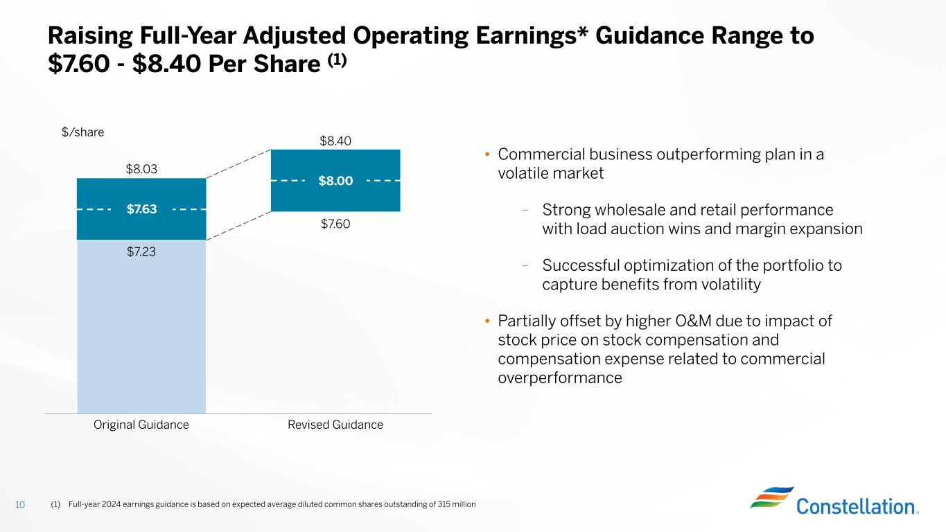 (1) Q2 2023 earnings per share is based on average diluted common shares outstanding of 325 million (2) Q2 2024 earnings per share is based on average diluted common shares outstanding of 316 million Q2 2024 Results 9 Year-over-Year Adj. Operating Earnings* Drivers $2.56 $2.58 $1.64 $1.68 GAAP Net Income Q2 2023 (1) GAAP Net Income Q2 2024 (2) Adjusted Operating Earnings* Q2 2023 (1) Adjusted Operating Earnings* Q2 2024 (2) • Continued strong commercial performance through portfolio optimization and better than average customer margins • Nuclear PTC with sharing of benefit under certain state programs • Higher nuclear output • Lower costs from refueling outages • Contribution from addition of ownership interest in the South Texas Project • Higher O&M • Lower revenue recognition from banked IL Zero Emission Credits (ZEC) Note: GAAP to Non-GAAP reconciliations for Adjusted Operating Earnings* can be found on page 29 of the Appendix $/share