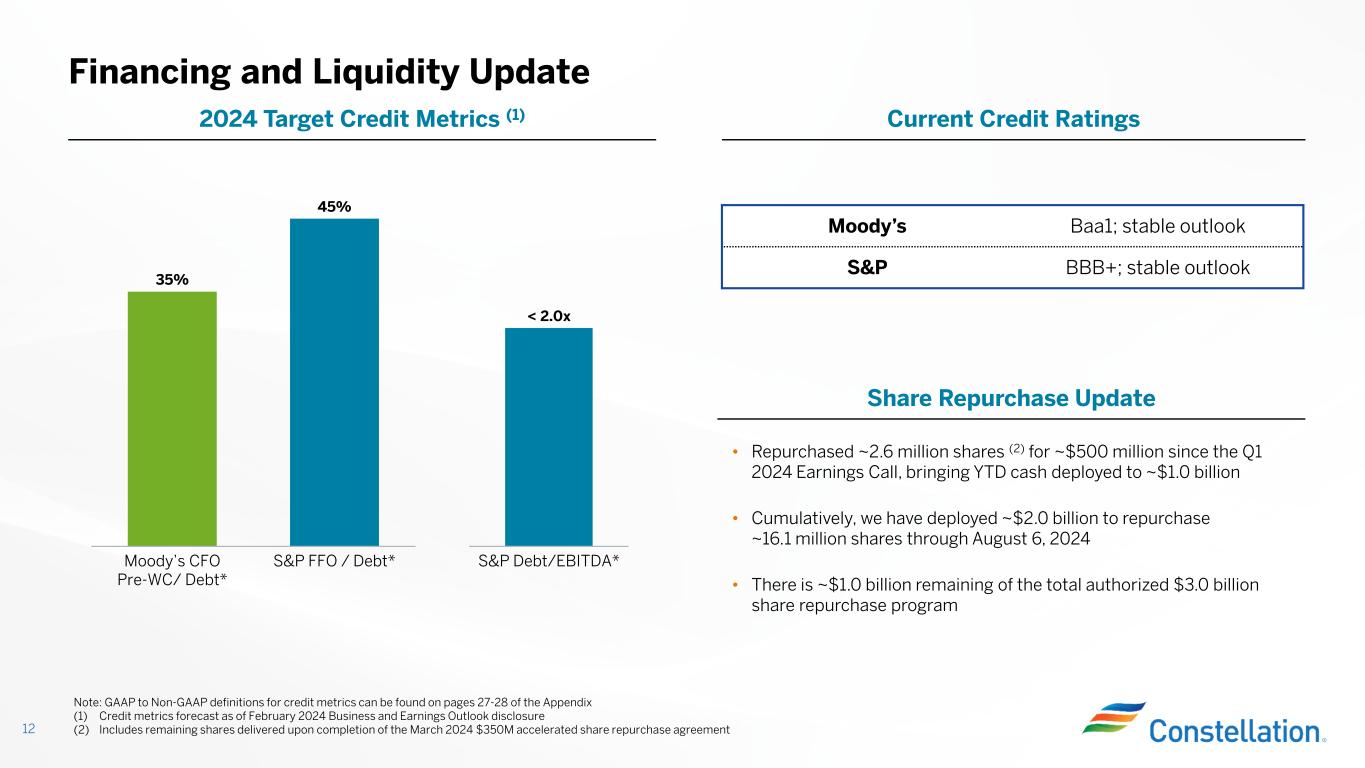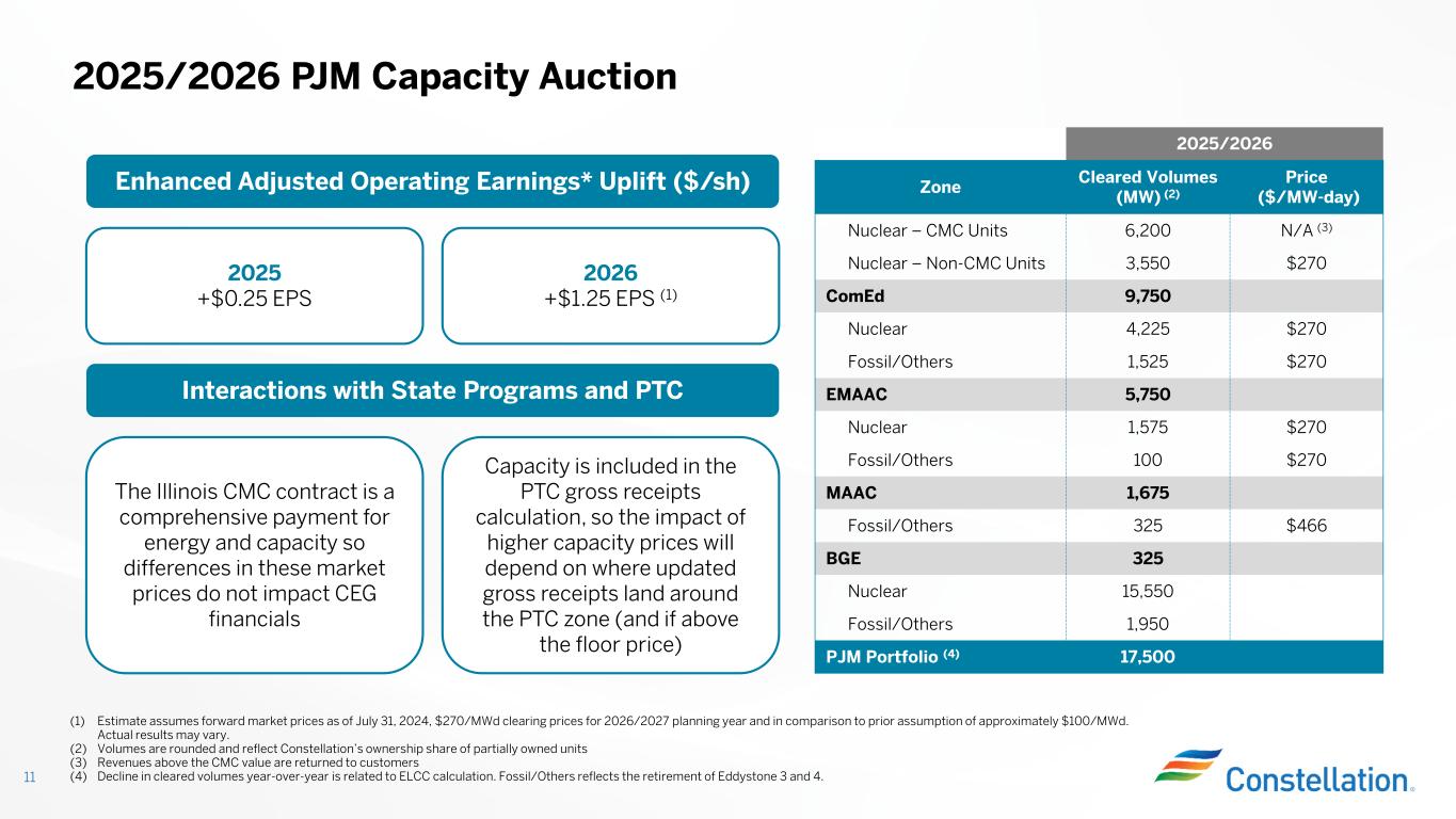 2025/2026 PJM Capacity Auction 11 2025/2026 Price ($/MW-day) Cleared Volumes (MW) (2)Zone N/A (3)6,200Nuclear – CMC Units $2703,550Nuclear – Non-CMC Units 9,750ComEd $2704,225Nuclear $2701,525Fossil/Others 5,750EMAAC $2701,575Nuclear $270100Fossil/Others 1,675MAAC $466325Fossil/Others 325BGE 15,550Nuclear 1,950Fossil/Others 17,500PJM Portfolio (4) (1) Estimate assumes forward market prices as of July 31, 2024, $270/MWd clearing prices for 2026/2027 planning year and in comparison to prior assumption of approximately $100/MWd. Actual results may vary. (2) Volumes are rounded and reflect Constellation’s ownership share of partially owned units (3) Revenues above the CMC value are returned to customers (4) Decline in cleared volumes year-over-year is related to ELCC calculation. Fossil/Others reflects the retirement of Eddystone 3 and 4. Enhanced Adjusted Operating Earnings* Uplift ($/sh) 2025 +$0.25 EPS 2026 +$1.25 EPS (1) Interactions with State Programs and PTC Capacity is included in the PTC gross receipts calculation, so the impact of higher capacity prices will depend on where updated gross receipts land around the PTC zone (and if above the floor price) The Illinois CMC contract is a comprehensive payment for energy and capacity so differences in these market prices do not impact CEG financials