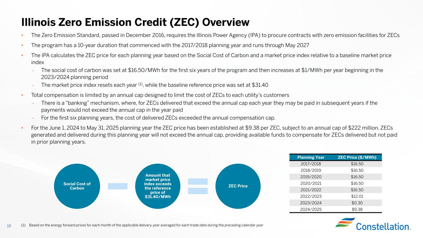 • The Zero Emission Standard, passed in December 2016, requires the Illinois Power Agency (IPA) to procure contracts with zero emission facilities for ZECs • The program has a 10-year duration that commenced with the 2017/2018 planning year and runs through May 2027 • The IPA calculates the ZEC price for each planning year based on the Social Cost of Carbon and a market price index relative to a baseline market price index – The social cost of carbon was set at $16.50/MWh for the first six years of the program and then increases at $1/MWh per year beginning in the 2023/2024 planning period – The market price index resets each year (1), while the baseline reference price was set at $31.40 • Total compensation is limited by an annual cap designed to limit the cost of ZECs to each utility’s customers – There is a “banking” mechanism, where, for ZECs delivered that exceed the annual cap each year they may be paid in subsequent years if the payments would not exceed the annual cap in the year paid – For the first six planning years, the cost of delivered ZECs exceeded the annual compensation cap. • For the June 1, 2024 to May 31, 2025 planning year the ZEC price has been established at $9.38 per ZEC, subject to an annual cap of $222 million. ZECs generated and delivered during this planning year will not exceed the annual cap, providing available funds to compensate for ZECs delivered but not paid in prior planning years. Illinois Zero Emission Credit (ZEC) Overview Social Cost of Carbon Amount that market price index exceeds the reference price of $31.40/MWh ZEC Price (1) Based on the energy forward prices for each month of the applicable delivery year averaged for each trade date during the preceding calendar year18 ZEC Price ($/MWh)Planning Year $16.502017/2018 $16.502018/2019 $16.502019/2020 $16.502020/2021 $16.502021/2022 $12.012022/2023 $0.302023/2024 $9.382024/2025