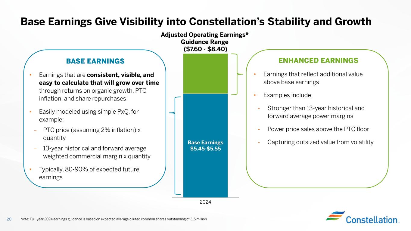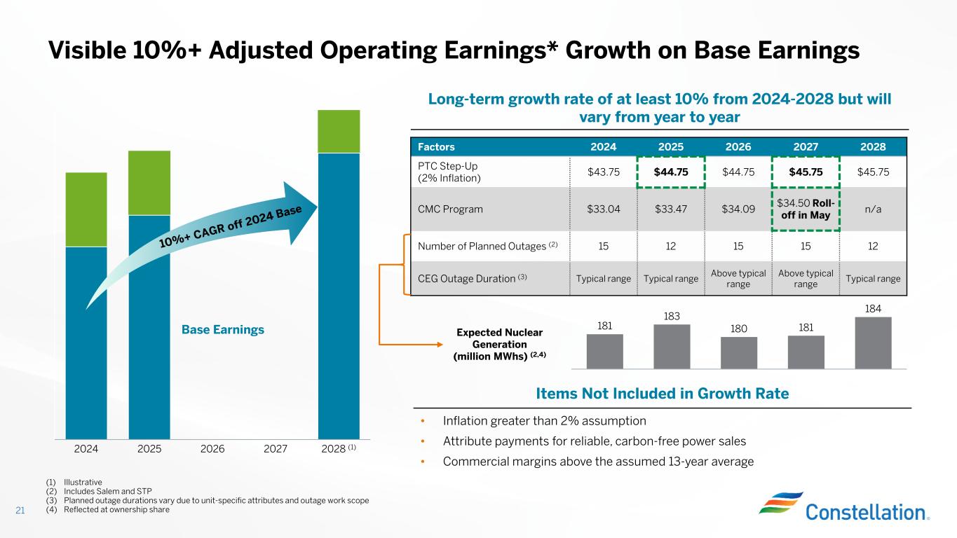 BASE EARNINGS • Earnings that are consistent, visible, and easy to calculate that will grow over time through returns on organic growth, PTC inflation, and share repurchases • Easily modeled using simple PxQ, for example: – PTC price (assuming 2% inflation) x quantity – 13-year historical and forward average weighted commercial margin x quantity • Typically, 80-90% of expected future earnings Base Earnings Give Visibility into Constellation’s Stability and Growth Base Earnings $5.45-$5.55 2024 Adjusted Operating Earnings* Guidance Range ($7.60 - $8.40) ENHANCED EARNINGS • Earnings that reflect additional value above base earnings • Examples include: - Stronger than 13-year historical and forward average power margins - Power price sales above the PTC floor - Capturing outsized value from volatility 20 Note: Full-year 2024 earnings guidance is based on expected average diluted common shares outstanding of 315 million