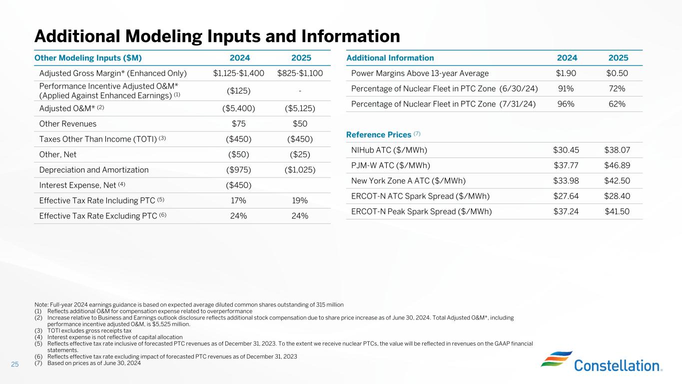 Detailed Modeling Inputs for Base Earnings (continued) 24 (1) Hydro revenue price and representative spark spread reflect consistent historical average we have achieved across hydro, natural gas, and oil assets, respectively (2) Volumes are rounded and reflect Constellation’s ownership share of partially owned units (3) ISO-NE: ISO New England; NEMA: Northeastern Massachusetts and Boston; SEMA: Southeastern Massachusetts (4) Represents offered capacity at ownership Expected Generation (million MWhs) Non-Nuclear (Energy) 2024 2025 Wind/Solar 5 5 Historical renewable contracts $60 - $70 Hydro 2 2 Hydro revenue price ($/MWh) $45 Natural Gas, Oil, Other 20 18 Representative spark spread ($/MWh) $20 2023/2024 2024/2025 2025/2026 Non-Nuclear (Capacity) Cleared Volumes (MW) (2) Price ($/MW-day) Cleared Volumes (MW) (2) Price ($/MW-day) Cleared Volumes (MW) (2) Price ($/MW-day) EMAAC - - 1,950 $55 1,525 $270 MAAC 2,175 $49 200 $49 100 $270 BGE 425 $70 425 $73 325 $466 Total PJM Portfolio 2,600 2,575 1,950 2023/2024 2024/2025 2025/2026 Capacity (4) Price ($/MW-day) Capacity (4) Price ($/MW-day) Capacity (4) Price ($/MW-day) NEMA 1,525 $66 115 $131 125 $87 SEMA 235 $597 235 $632 235 $87 Total ISO-NE (3) 1,760 350 360 Note: Capacity revenues for nuclear units are included in the gross receipts calculation for the PTC and therefore not provided Modeling Prices ($/MWh) (1)