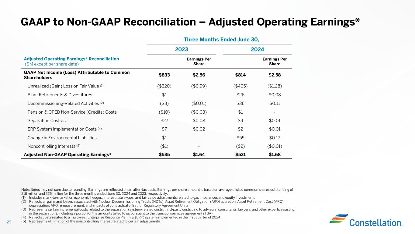 Three Months Ended June 30, 20242023 Earnings Per Share Earnings Per Share Adjusted Operating Earnings* Reconciliation ($M except per share data) $2.58$814$2.56$833 GAAP Net Income (Loss) Attributable to Common Shareholders ($1.28)($405)($0.99)($320)Unrealized (Gain) Loss on Fair Value (1) $0.08$26-$1Plant Retirements & Divestitures $0.11$36($0.01)($3)Decommissioning-Related Activities (2) -$1($0.03)($10)Pension & OPEB Non-Service (Credits) Costs $0.01$4$0.08$27Separation Costs (3) $0.01$2$0.02$7ERP System Implementation Costs (4) $0.17$55-$1Change in Environmental Liabilities ($0.01)($2)-($1)Noncontrolling Interests (5) $1.68$531$1.64$535Adjusted Non-GAAP Operating Earnings* GAAP to Non-GAAP Reconciliation – Adjusted Operating Earnings* 29 Note: Items may not sum due to rounding. Earnings are reflected on an after-tax basis. Earnings per share amount is based on average diluted common shares outstanding of 316 million and 325 million for the three months ended June 30, 2024 and 2023, respectively. (1) Includes mark-to-market on economic hedges, interest rate swaps, and fair value adjustments related to gas imbalances and equity investments (2) Reflects all gains and losses associated with Nuclear Decommissioning Trusts (NDTs), Asset Retirement Obligation (ARO) accretion, Asset Retirement Cost (ARC) depreciation, ARO remeasurement, and impacts of contractual offset for Regulatory Agreement Units (3) Represents certain incremental costs related to the separation (system-related costs, third-party costs paid to advisors, consultants, lawyers, and other experts assisting in the separation), including a portion of the amounts billed to us pursuant to the transition services agreement (TSA) (4) Reflects costs related to a multi-year Enterprise Resource Planning (ERP) system implemented in the first quarter of 2024 (5) Represents elimination of the noncontrolling interest related to certain adjustments