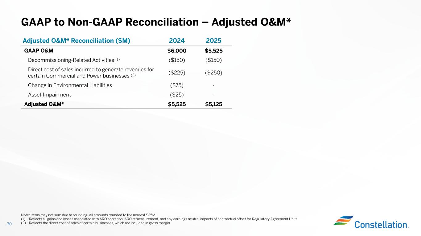 GAAP to Non-GAAP Reconciliation – Adjusted O&M* 30 20252024Adjusted O&M* Reconciliation ($M) $5,525$6,000GAAP O&M ($150)($150)Decommissioning-Related Activities (1) ($250)($225) Direct cost of sales incurred to generate revenues for certain Commercial and Power businesses (2) -($75)Change in Environmental Liabilities -($25)Asset Impairment $5,125$5,525Adjusted O&M* Note: Items may not sum due to rounding. All amounts rounded to the nearest $25M. (1) Reflects all gains and losses associated with ARO accretion, ARO remeasurement, and any earnings neutral impacts of contractual offset for Regulatory Agreement Units (2) Reflects the direct cost of sales of certain businesses, which are included in gross margin