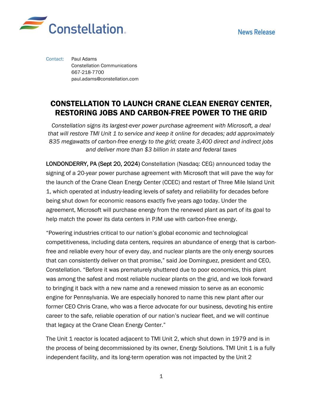 1 Contact: Paul Adams Constellation Communications 667-218-7700 paul.adams@constellation.com CONSTELLATION TO LAUNCH CRANE CLEAN ENERGY CENTER, RESTORING JOBS AND CARBON-FREE POWER TO THE GRID Constellation signs its largest-ever power purchase agreement with Microsoft, a deal that will restore TMI Unit 1 to service and keep it online for decades; add approximately 835 megawatts of carbon-free energy to the grid; create 3,400 direct and indirect jobs and deliver more than $3 billion in state and federal taxes LONDONDERRY, PA (Sept 20, 2024) Constellation (Nasdaq: CEG) announced today the signing of a 20-year power purchase agreement with Microsoft that will pave the way for the launch of the Crane Clean Energy Center (CCEC) and restart of Three Mile Island Unit 1, which operated at industry-leading levels of safety and reliability for decades before being shut down for economic reasons exactly five years ago today. Under the agreement, Microsoft will purchase energy from the renewed plant as part of its goal to help match the power its data centers in PJM use with carbon-free energy. “Powering industries critical to our nation’s global economic and technological competitiveness, including data centers, requires an abundance of energy that is carbon- free and reliable every hour of every day, and nuclear plants are the only energy sources that can consistently deliver on that promise,” said Joe Dominguez, president and CEO, Constellation. “Before it was prematurely shuttered due to poor economics, this plant was among the safest and most reliable nuclear plants on the grid, and we look forward to bringing it back with a new name and a renewed mission to serve as an economic engine for Pennsylvania. We are especially honored to name this new plant after our former CEO Chris Crane, who was a fierce advocate for our business, devoting his entire career to the safe, reliable operation of our nation’s nuclear fleet, and we will continue that legacy at the Crane Clean Energy Center.” The Unit 1 reactor is located adjacent to TMI Unit 2, which shut down in 1979 and is in the process of being decommissioned by its owner, Energy Solutions. TMI Unit 1 is a fully independent facility, and its long-term operation was not impacted by the Unit 2