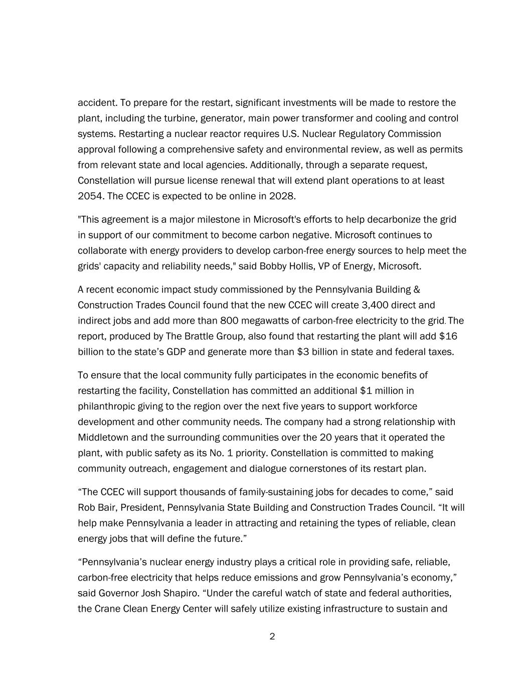 2 accident. To prepare for the restart, significant investments will be made to restore the plant, including the turbine, generator, main power transformer and cooling and control systems. Restarting a nuclear reactor requires U.S. Nuclear Regulatory Commission approval following a comprehensive safety and environmental review, as well as permits from relevant state and local agencies. Additionally, through a separate request, Constellation will pursue license renewal that will extend plant operations to at least 2054. The CCEC is expected to be online in 2028. "This agreement is a major milestone in Microsoft's efforts to help decarbonize the grid in support of our commitment to become carbon negative. Microsoft continues to collaborate with energy providers to develop carbon-free energy sources to help meet the grids' capacity and reliability needs," said Bobby Hollis, VP of Energy, Microsoft. A recent economic impact study commissioned by the Pennsylvania Building & Construction Trades Council found that the new CCEC will create 3,400 direct and indirect jobs and add more than 800 megawatts of carbon-free electricity to the grid. The report, produced by The Brattle Group, also found that restarting the plant will add $16 billion to the state’s GDP and generate more than $3 billion in state and federal taxes. To ensure that the local community fully participates in the economic benefits of restarting the facility, Constellation has committed an additional $1 million in philanthropic giving to the region over the next five years to support workforce development and other community needs. The company had a strong relationship with Middletown and the surrounding communities over the 20 years that it operated the plant, with public safety as its No. 1 priority. Constellation is committed to making community outreach, engagement and dialogue cornerstones of its restart plan. “The CCEC will support thousands of family-sustaining jobs for decades to come,” said Rob Bair, President, Pennsylvania State Building and Construction Trades Council. “It will help make Pennsylvania a leader in attracting and retaining the types of reliable, clean energy jobs that will define the future.” “Pennsylvania’s nuclear energy industry plays a critical role in providing safe, reliable, carbon-free electricity that helps reduce emissions and grow Pennsylvania’s economy,” said Governor Josh Shapiro. “Under the careful watch of state and federal authorities, the Crane Clean Energy Center will safely utilize existing infrastructure to sustain and