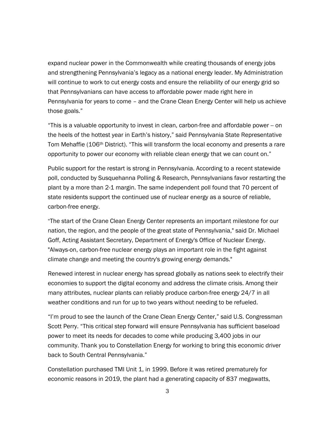 3 expand nuclear power in the Commonwealth while creating thousands of energy jobs and strengthening Pennsylvania’s legacy as a national energy leader. My Administration will continue to work to cut energy costs and ensure the reliability of our energy grid so that Pennsylvanians can have access to affordable power made right here in Pennsylvania for years to come – and the Crane Clean Energy Center will help us achieve those goals.” “This is a valuable opportunity to invest in clean, carbon-free and affordable power -- on the heels of the hottest year in Earth’s history,” said Pennsylvania State Representative Tom Mehaffie (106th District). “This will transform the local economy and presents a rare opportunity to power our economy with reliable clean energy that we can count on.” Public support for the restart is strong in Pennsylvania. According to a recent statewide poll, conducted by Susquehanna Polling & Research, Pennsylvanians favor restarting the plant by a more than 2-1 margin. The same independent poll found that 70 percent of state residents support the continued use of nuclear energy as a source of reliable, carbon-free energy. "The start of the Crane Clean Energy Center represents an important milestone for our nation, the region, and the people of the great state of Pennsylvania," said Dr. Michael Goff, Acting Assistant Secretary, Department of Energy's Office of Nuclear Energy. "Always-on, carbon-free nuclear energy plays an important role in the fight against climate change and meeting the country's growing energy demands." Renewed interest in nuclear energy has spread globally as nations seek to electrify their economies to support the digital economy and address the climate crisis. Among their many attributes, nuclear plants can reliably produce carbon-free energy 24/7 in all weather conditions and run for up to two years without needing to be refueled. “I’m proud to see the launch of the Crane Clean Energy Center,” said U.S. Congressman Scott Perry. “This critical step forward will ensure Pennsylvania has sufficient baseload power to meet its needs for decades to come while producing 3,400 jobs in our community. Thank you to Constellation Energy for working to bring this economic driver back to South Central Pennsylvania.” Constellation purchased TMI Unit 1, in 1999. Before it was retired prematurely for economic reasons in 2019, the plant had a generating capacity of 837 megawatts,