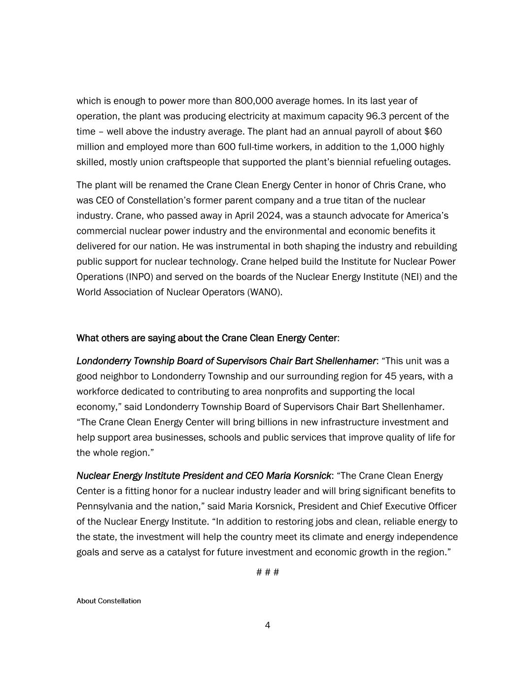 4 which is enough to power more than 800,000 average homes. In its last year of operation, the plant was producing electricity at maximum capacity 96.3 percent of the time – well above the industry average. The plant had an annual payroll of about $60 million and employed more than 600 full-time workers, in addition to the 1,000 highly skilled, mostly union craftspeople that supported the plant’s biennial refueling outages. The plant will be renamed the Crane Clean Energy Center in honor of Chris Crane, who was CEO of Constellation’s former parent company and a true titan of the nuclear industry. Crane, who passed away in April 2024, was a staunch advocate for America’s commercial nuclear power industry and the environmental and economic benefits it delivered for our nation. He was instrumental in both shaping the industry and rebuilding public support for nuclear technology. Crane helped build the Institute for Nuclear Power Operations (INPO) and served on the boards of the Nuclear Energy Institute (NEI) and the World Association of Nuclear Operators (WANO). What others are saying about the Crane Clean Energy Center: Londonderry Township Board of Supervisors Chair Bart Shellenhamer: “This unit was a good neighbor to Londonderry Township and our surrounding region for 45 years, with a workforce dedicated to contributing to area nonprofits and supporting the local economy,” said Londonderry Township Board of Supervisors Chair Bart Shellenhamer. “The Crane Clean Energy Center will bring billions in new infrastructure investment and help support area businesses, schools and public services that improve quality of life for the whole region.” Nuclear Energy Institute President and CEO Maria Korsnick: “The Crane Clean Energy Center is a fitting honor for a nuclear industry leader and will bring significant benefits to Pennsylvania and the nation,” said Maria Korsnick, President and Chief Executive Officer of the Nuclear Energy Institute. “In addition to restoring jobs and clean, reliable energy to the state, the investment will help the country meet its climate and energy independence goals and serve as a catalyst for future investment and economic growth in the region.” # # #