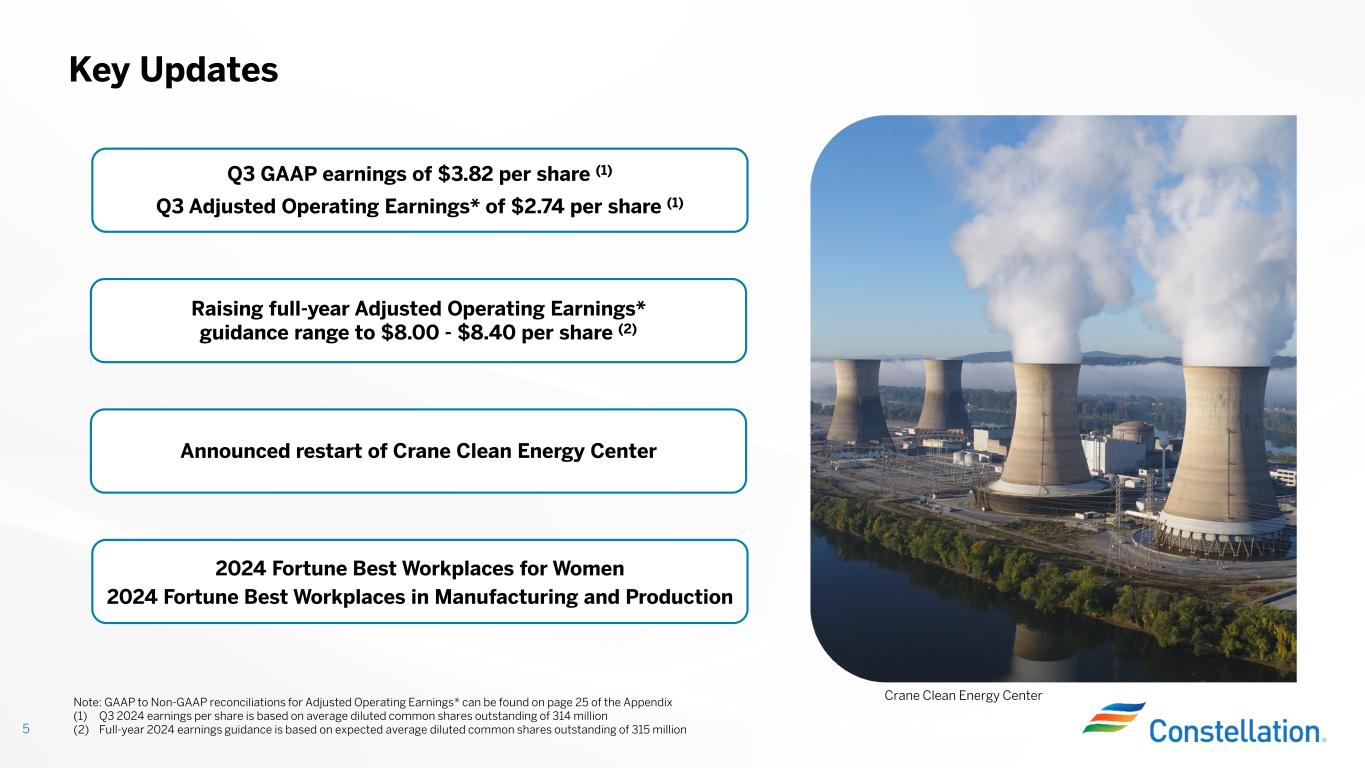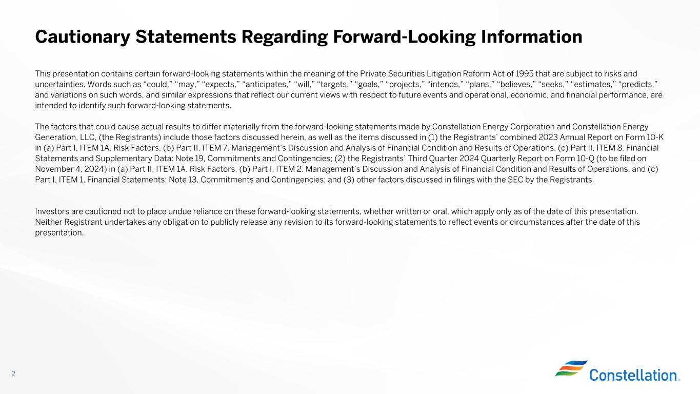 This presentation contains certain forward-looking statements within the meaning of the Private Securities Litigation Reform Act of 1995 that are subject to risks and uncertainties. Words such as “could,” “may,” “expects,” “anticipates,” “will,” “targets,” “goals,” “projects,” “intends,” “plans,” “believes,” “seeks,” “estimates,” “predicts,” and variations on such words, and similar expressions that reflect our current views with respect to future events and operational, economic, and financial performance, are intended to identify such forward-looking statements. The factors that could cause actual results to differ materially from the forward-looking statements made by Constellation Energy Corporation and Constellation Energy Generation, LLC, (the Registrants) include those factors discussed herein, as well as the items discussed in (1) the Registrants’ combined 2023 Annual Report on Form 10-K in (a) Part I, ITEM 1A. Risk Factors, (b) Part II, ITEM 7. Management’s Discussion and Analysis of Financial Condition and Results of Operations, (c) Part II, ITEM 8. Financial Statements and Supplementary Data: Note 19, Commitments and Contingencies; (2) the Registrants’ Third Quarter 2024 Quarterly Report on Form 10-Q (to be filed on November 4, 2024) in (a) Part II, ITEM 1A. Risk Factors, (b) Part I, ITEM 2. Management’s Discussion and Analysis of Financial Condition and Results of Operations, and (c) Part I, ITEM 1. Financial Statements: Note 13, Commitments and Contingencies; and (3) other factors discussed in filings with the SEC by the Registrants. Investors are cautioned not to place undue reliance on these forward-looking statements, whether written or oral, which apply only as of the date of this presentation. Neither Registrant undertakes any obligation to publicly release any revision to its forward-looking statements to reflect events or circumstances after the date of this presentation. Cautionary Statements Regarding Forward-Looking Information 2