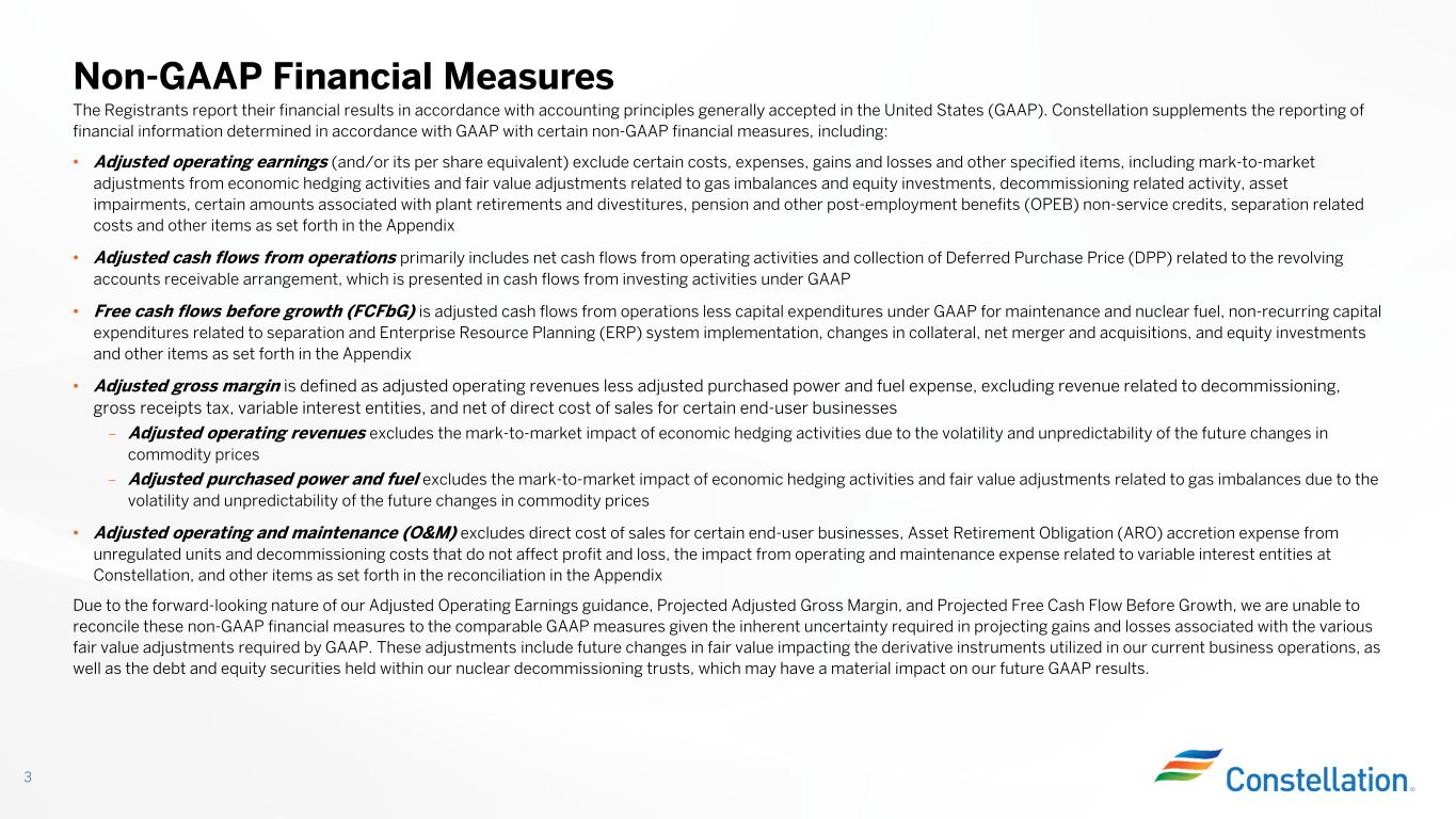 The Registrants report their financial results in accordance with accounting principles generally accepted in the United States (GAAP). Constellation supplements the reporting of financial information determined in accordance with GAAP with certain non-GAAP financial measures, including: • Adjusted operating earnings (and/or its per share equivalent) exclude certain costs, expenses, gains and losses and other specified items, including mark-to-market adjustments from economic hedging activities and fair value adjustments related to gas imbalances and equity investments, decommissioning related activity, asset impairments, certain amounts associated with plant retirements and divestitures, pension and other post-employment benefits (OPEB) non-service credits, separation related costs and other items as set forth in the Appendix • Adjusted cash flows from operations primarily includes net cash flows from operating activities and collection of Deferred Purchase Price (DPP) related to the revolving accounts receivable arrangement, which is presented in cash flows from investing activities under GAAP • Free cash flows before growth (FCFbG) is adjusted cash flows from operations less capital expenditures under GAAP for maintenance and nuclear fuel, non-recurring capital expenditures related to separation and Enterprise Resource Planning (ERP) system implementation, changes in collateral, net merger and acquisitions, and equity investments and other items as set forth in the Appendix • Adjusted gross margin is defined as adjusted operating revenues less adjusted purchased power and fuel expense, excluding revenue related to decommissioning, gross receipts tax, variable interest entities, and net of direct cost of sales for certain end-user businesses – Adjusted operating revenues excludes the mark-to-market impact of economic hedging activities due to the volatility and unpredictability of the future changes in commodity prices – Adjusted purchased power and fuel excludes the mark-to-market impact of economic hedging activities and fair value adjustments related to gas imbalances due to the volatility and unpredictability of the future changes in commodity prices • Adjusted operating and maintenance (O&M) excludes direct cost of sales for certain end-user businesses, Asset Retirement Obligation (ARO) accretion expense from unregulated units and decommissioning costs that do not affect profit and loss, the impact from operating and maintenance expense related to variable interest entities at Constellation, and other items as set forth in the reconciliation in the Appendix Due to the forward-looking nature of our Adjusted Operating Earnings guidance, Projected Adjusted Gross Margin, and Projected Free Cash Flow Before Growth, we are unable to reconcile these non-GAAP financial measures to the comparable GAAP measures given the inherent uncertainty required in projecting gains and losses associated with the various fair value adjustments required by GAAP. These adjustments include future changes in fair value impacting the derivative instruments utilized in our current business operations, as well as the debt and equity securities held within our nuclear decommissioning trusts, which may have a material impact on our future GAAP results. Non-GAAP Financial Measures 3