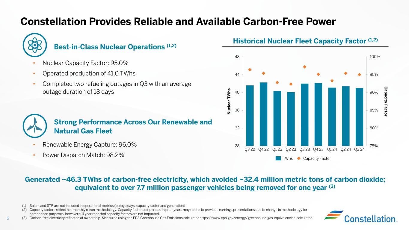 Key Updates 5 Announced restart of Crane Clean Energy Center (1) Q3 2024 earnings per share is based on average diluted common shares outstanding of 314 million (2) Full-year 2024 earnings guidance is based on expected average diluted common shares outstanding of 315 million Note: GAAP to Non-GAAP reconciliations for Adjusted Operating Earnings* can be found on page 25 of the Appendix Crane Clean Energy Center 2024 Fortune Best Workplaces for Women 2024 Fortune Best Workplaces in Manufacturing and Production Q3 GAAP earnings of $3.82 per share (1) Q3 Adjusted Operating Earnings* of $2.74 per share (1) Raising full-year Adjusted Operating Earnings* guidance range to $8.00 - $8.40 per share (2)