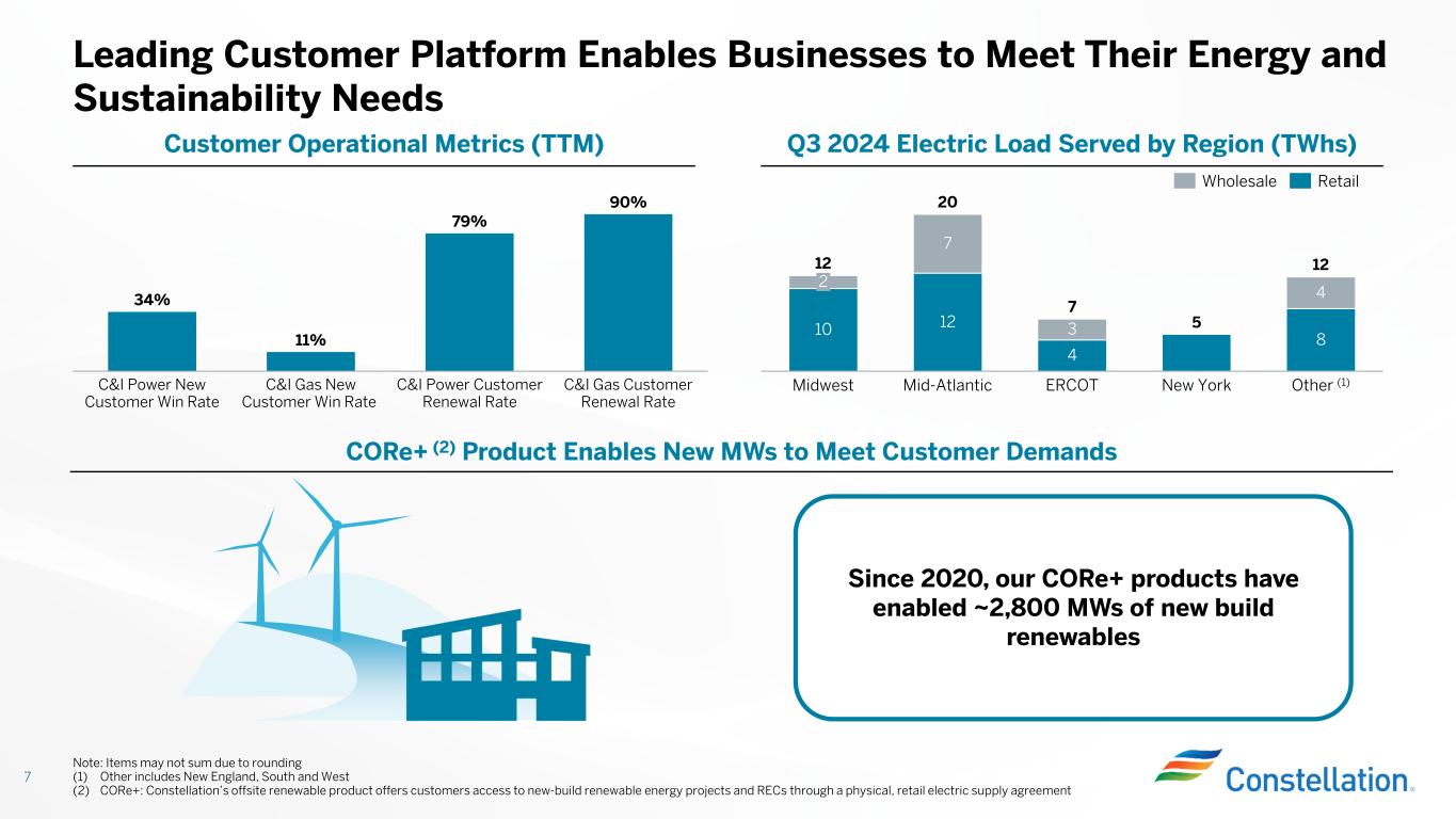 Best-in-Class Nuclear Operations (1,2) • Nuclear Capacity Factor: 95.0% • Operated production of 41.0 TWhs • Completed two refueling outages in Q3 with an average outage duration of 18 days 6 Constellation Provides Reliable and Available Carbon-Free Power (1) Salem and STP are not included in operational metrics (outage days, capacity factor and generation) (2) Capacity factors reflect net monthly mean methodology. Capacity factors for periods in prior years may not tie to previous earnings presentations due to change in methodology for comparison purposes, however full year reported capacity factors are not impacted. (3) Carbon-free electricity reflected at ownership. Measured using the EPA Greenhouse Gas Emissions calculator https://www.epa.gov/energy/greenhouse-gas-equivalencies-calculator. 75% 80% 85% 90% 95% 100% 28 32 36 40 44 48 N u cl ea r T W h s C ap acity F acto r Q3 22 Q4 22 Q1 23 Q2 23 Q3 23 Q4 23 Q1 24 Q2 24 Q3 24 TWhs Capacity Factor Generated ~46.3 TWhs of carbon-free electricity, which avoided ~32.4 million metric tons of carbon dioxide; equivalent to over 7.7 million passenger vehicles being removed for one year (3) Historical Nuclear Fleet Capacity Factor (1,2) Strong Performance Across Our Renewable and Natural Gas Fleet • Renewable Energy Capture: 96.0% • Power Dispatch Match: 98.2%