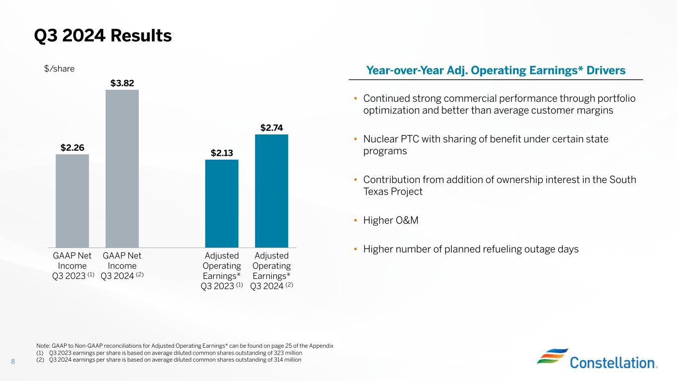 Leading Customer Platform Enables Businesses to Meet Their Energy and Sustainability Needs 7 Note: Items may not sum due to rounding (1) Other includes New England, South and West (2) CORe+: Constellation’s offsite renewable product offers customers access to new-build renewable energy projects and RECs through a physical, retail electric supply agreement Q3 2024 Electric Load Served by Region (TWhs)Customer Operational Metrics (TTM) 10 12 4 5 8 7 3 4 2 Midwest Mid-Atlantic ERCOT New York Other (1) 12 20 7 12 Wholesale Retail 34% 11% 79% 90% C&I Power New Customer Win Rate C&I Gas New Customer Win Rate C&I Power Customer Renewal Rate C&I Gas Customer Renewal Rate CORe+ (2) Product Enables New MWs to Meet Customer Demands Since 2020, our CORe+ products have enabled ~2,800 MWs of new build renewables