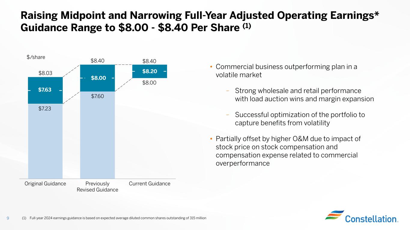 (1) Q3 2023 earnings per share is based on average diluted common shares outstanding of 323 million (2) Q3 2024 earnings per share is based on average diluted common shares outstanding of 314 million Q3 2024 Results 8 Year-over-Year Adj. Operating Earnings* Drivers $2.26 $3.82 $2.13 $2.74 GAAP Net Income Q3 2023 (1) GAAP Net Income Q3 2024 (2) Adjusted Operating Earnings* Q3 2023 (1) Adjusted Operating Earnings* Q3 2024 (2) • Continued strong commercial performance through portfolio optimization and better than average customer margins • Nuclear PTC with sharing of benefit under certain state programs • Contribution from addition of ownership interest in the South Texas Project • Higher O&M • Higher number of planned refueling outage days Note: GAAP to Non-GAAP reconciliations for Adjusted Operating Earnings* can be found on page 25 of the Appendix $/share