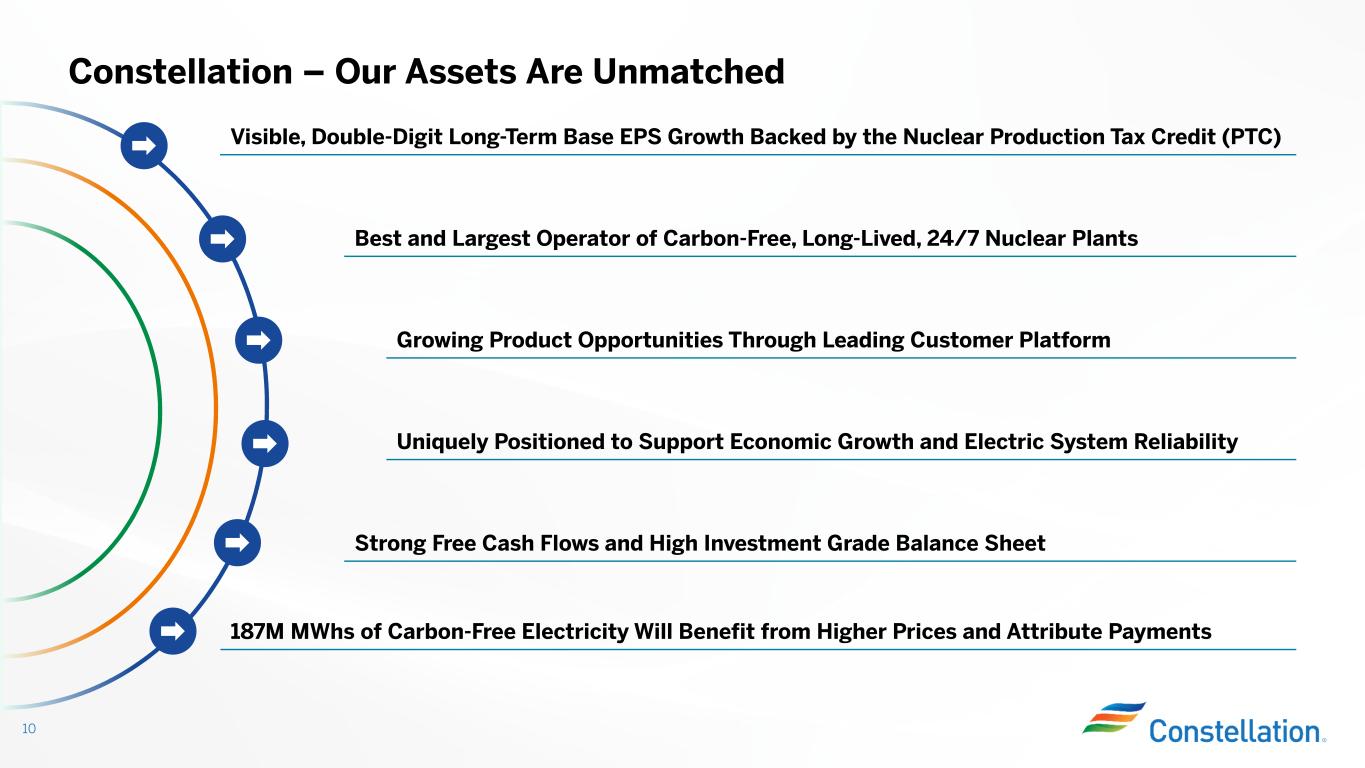 (1) Full-year 2024 earnings guidance is based on expected average diluted common shares outstanding of 315 million Raising Midpoint and Narrowing Full-Year Adjusted Operating Earnings* Guidance Range to $8.00 - $8.40 Per Share (1) 9 • Commercial business outperforming plan in a volatile market – Strong wholesale and retail performance with load auction wins and margin expansion – Successful optimization of the portfolio to capture benefits from volatility • Partially offset by higher O&M due to impact of stock price on stock compensation and compensation expense related to commercial overperformance $/share Original Guidance Previously Revised Guidance Current Guidance $8.03 $8.40 $7.23 $7.63 $7.60 $8.00 $8.00 $8.20 $8.40