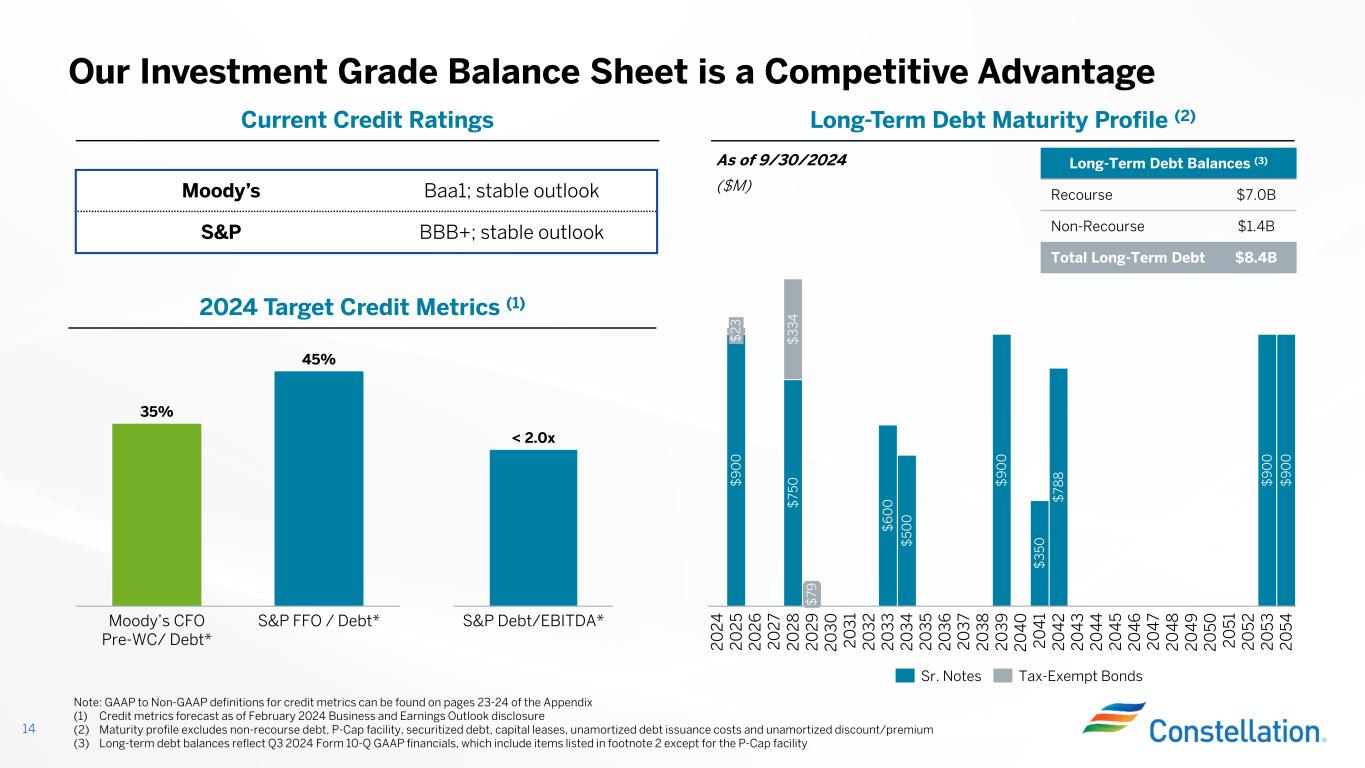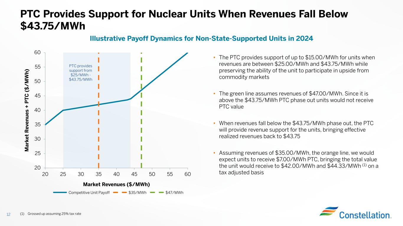 Maximum PTC Gross Receipts Threshold Power Price At Which PTC=$0 Maximum PTC Gross Receipts Threshold Power Price At Which PTC=$0 Maximum PTC Gross Receipts Threshold Power Price At Which PTC=$0 2024 15.00$ 25.00$ 43.75$ 15.00$ 25.00$ 43.75$ 15.00$ 25.00$ 43.75$ 2025 15.00$ 26.00$ 44.75$ 15.00$ 26.00$ 44.75$ 15.00$ 26.00$ 44.75$ 2026 15.00$ 26.00$ 44.75$ 15.00$ 27.00$ 45.75$ 15.00$ 27.00$ 45.75$ 2027 15.00$ 27.00$ 45.75$ 17.50$ 27.00$ 48.88$ 17.50$ 28.00$ 49.88$ 2028 15.00$ 27.00$ 45.75$ 17.50$ 28.00$ 49.88$ 17.50$ 29.00$ 50.88$ 2029 17.50$ 28.00$ 49.88$ 17.50$ 29.00$ 50.88$ 17.50$ 30.00$ 51.88$ 2030 17.50$ 28.00$ 49.88$ 17.50$ 30.00$ 51.88$ 20.00$ 32.00$ 57.00$ 2031 17.50$ 29.00$ 50.88$ 17.50$ 31.00$ 52.88$ 20.00$ 33.00$ 58.00$ 2032 17.50$ 29.00$ 50.88$ 20.00$ 32.00$ 57.00$ 20.00$ 34.00$ 59.00$ 2% Inflation 3% Inflation 4% Inflation • Starting in 2025, the maximum PTC and gross receipts threshold are subject to an inflation adjustment based on the GDP price deflator for the preceding calendar year: • Maximum PTC is rounded to nearest $2.50/MWh and gross receipts threshold is rounded to nearest $1.00/MWh Inflation of Nuclear Production Tax Credit (PTC) (1) 13 (1) See H.R. 5376 for additional details; all numbers assume that prevailing wage requirements are satisfied (2) Annual inflation adjustment is consistent with past published guidance for renewable energy credits, published annually Example Assuming 2%, 3% and 4% Inflation (2)PTC Overview Inflation Adjustment= GDP price deflator in preceeding year GDP price deflator in 2023 PTC Inflation Adjustment • The PTC is in effect through 12/31/32 • In the base year 2024, Constellation qualifies for the nuclear PTC up to $15.00/MWh; the PTC amount is reduced by 80% of gross receipts exceeding $25.00/MWh, phasing out completely after $43.75/MWh • The nuclear PTC can be credited against taxes or monetized through sale to an unrelated taxpayer