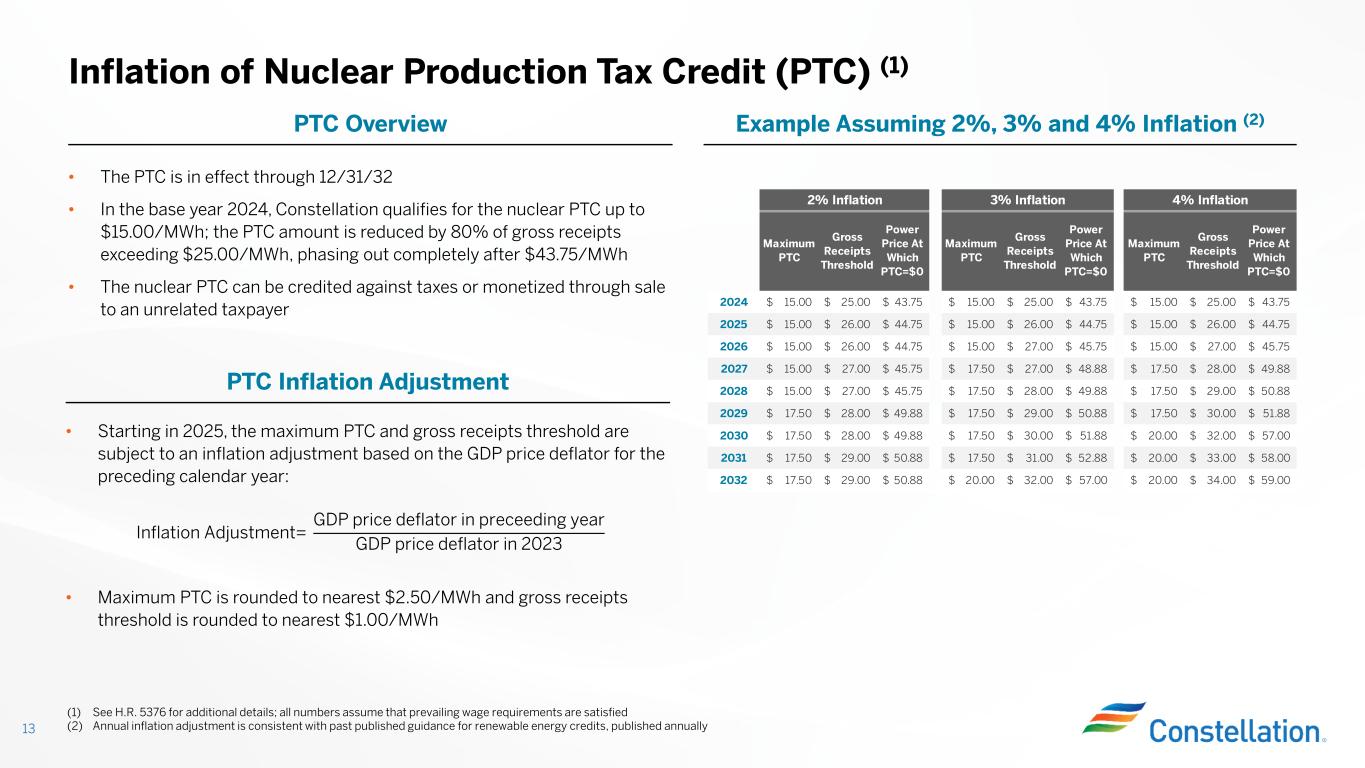 20 25 30 35 40 45 50 55 60 20 25 30 35 40 45 50 55 60 Market Revenues ($/MWh) M ar ke t R ev en u es + P T C ( $ / M W h ) 12 PTC Provides Support for Nuclear Units When Revenues Fall Below $43.75/MWh Illustrative Payoff Dynamics for Non-State-Supported Units in 2024 • The PTC provides support of up to $15.00/MWh for units when revenues are between $25.00/MWh and $43.75/MWh while preserving the ability of the unit to participate in upside from commodity markets • The green line assumes revenues of $47.00/MWh. Since it is above the $43.75/MWh PTC phase out units would not receive PTC value • When revenues fall below the $43.75/MWh phase out, the PTC will provide revenue support for the units, bringing effective realized revenues back to $43.75 • Assuming revenues of $35.00/MWh, the orange line, we would expect units to receive $7.00/MWh PTC, bringing the total value the unit would receive to $42.00/MWh and $44.33/MWh (1) on a tax adjusted basis Competitive Unit Payoff $35/MWh $47/MWh PTC provides support from $25/MWh - $43.75/MWh (1) Grossed up assuming 25% tax rate