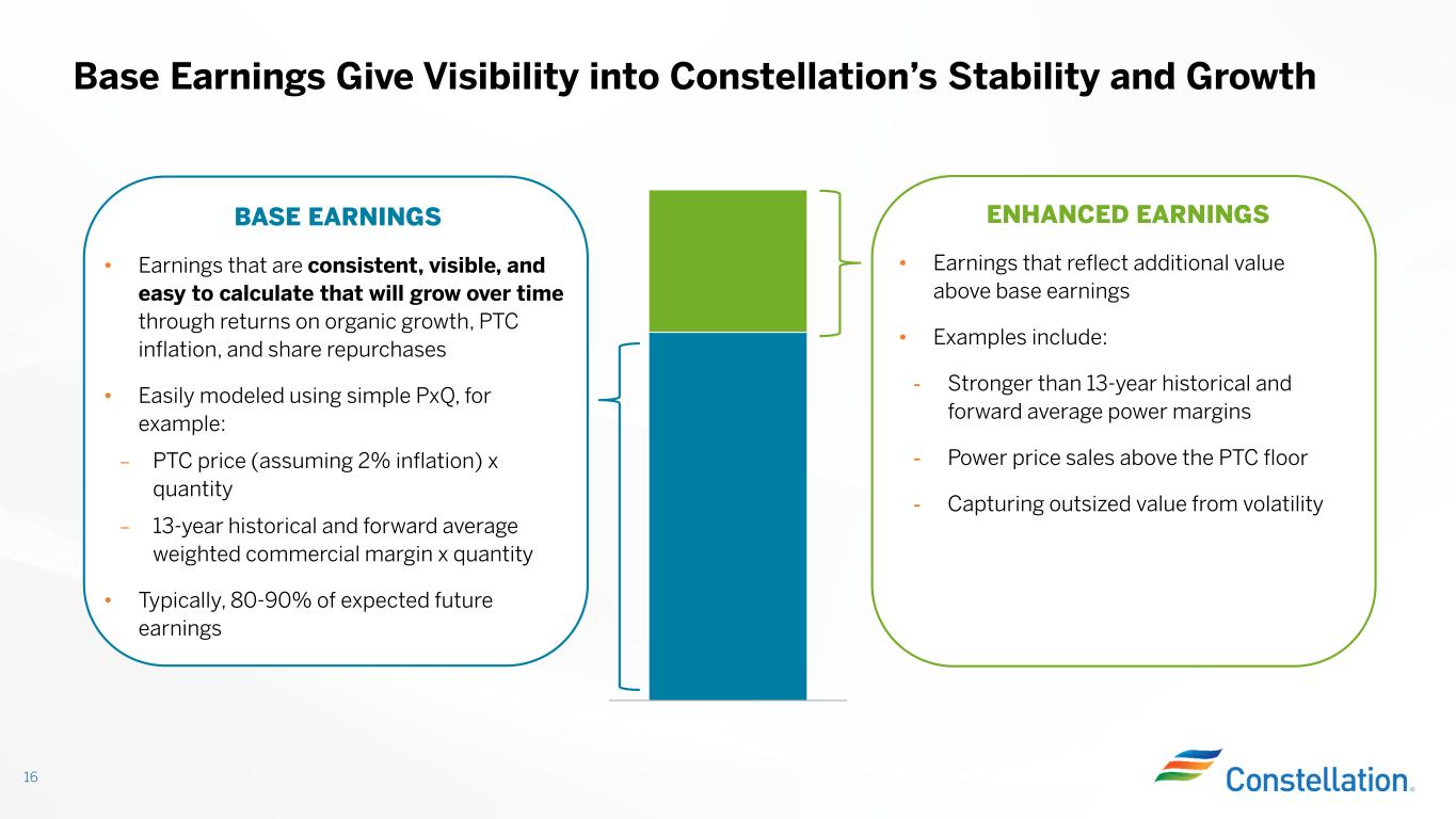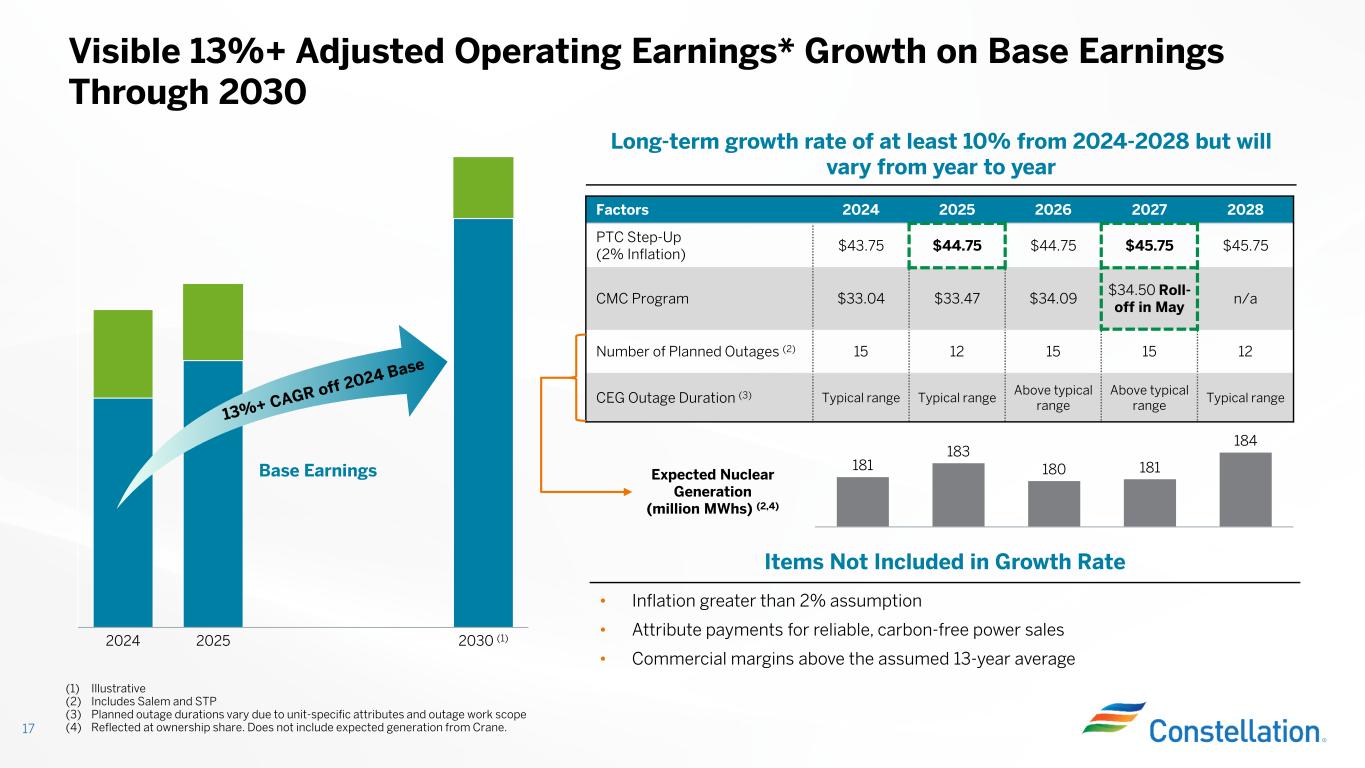 BASE EARNINGS • Earnings that are consistent, visible, and easy to calculate that will grow over time through returns on organic growth, PTC inflation, and share repurchases • Easily modeled using simple PxQ, for example: – PTC price (assuming 2% inflation) x quantity – 13-year historical and forward average weighted commercial margin x quantity • Typically, 80-90% of expected future earnings Base Earnings Give Visibility into Constellation’s Stability and Growth ENHANCED EARNINGS • Earnings that reflect additional value above base earnings • Examples include: - Stronger than 13-year historical and forward average power margins - Power price sales above the PTC floor - Capturing outsized value from volatility 16