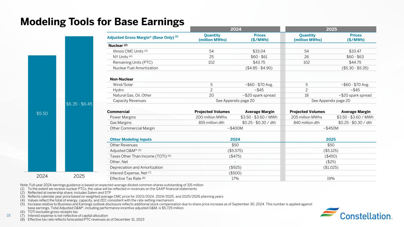 2024 2025 2030 (1) 17 Visible 13%+ Adjusted Operating Earnings* Growth on Base Earnings Through 2030 Long-term growth rate of at least 10% from 2024-2028 but will vary from year to year • Inflation greater than 2% assumption • Attribute payments for reliable, carbon-free power sales • Commercial margins above the assumed 13-year average Items Not Included in Growth Rate 20282027202620252024Factors $45.75$45.75$44.75$44.75$43.75 PTC Step-Up (2% Inflation) n/a $34.50 Roll- off in May $34.09$33.47$33.04CMC Program 1215151215Number of Planned Outages (2) Typical range Above typical range Above typical range Typical rangeTypical rangeCEG Outage Duration (3) Base Earnings 181 183 180 181 184 Expected Nuclear Generation (million MWhs) (2,4) (1) Illustrative (2) Includes Salem and STP (3) Planned outage durations vary due to unit-specific attributes and outage work scope (4) Reflected at ownership share. Does not include expected generation from Crane.