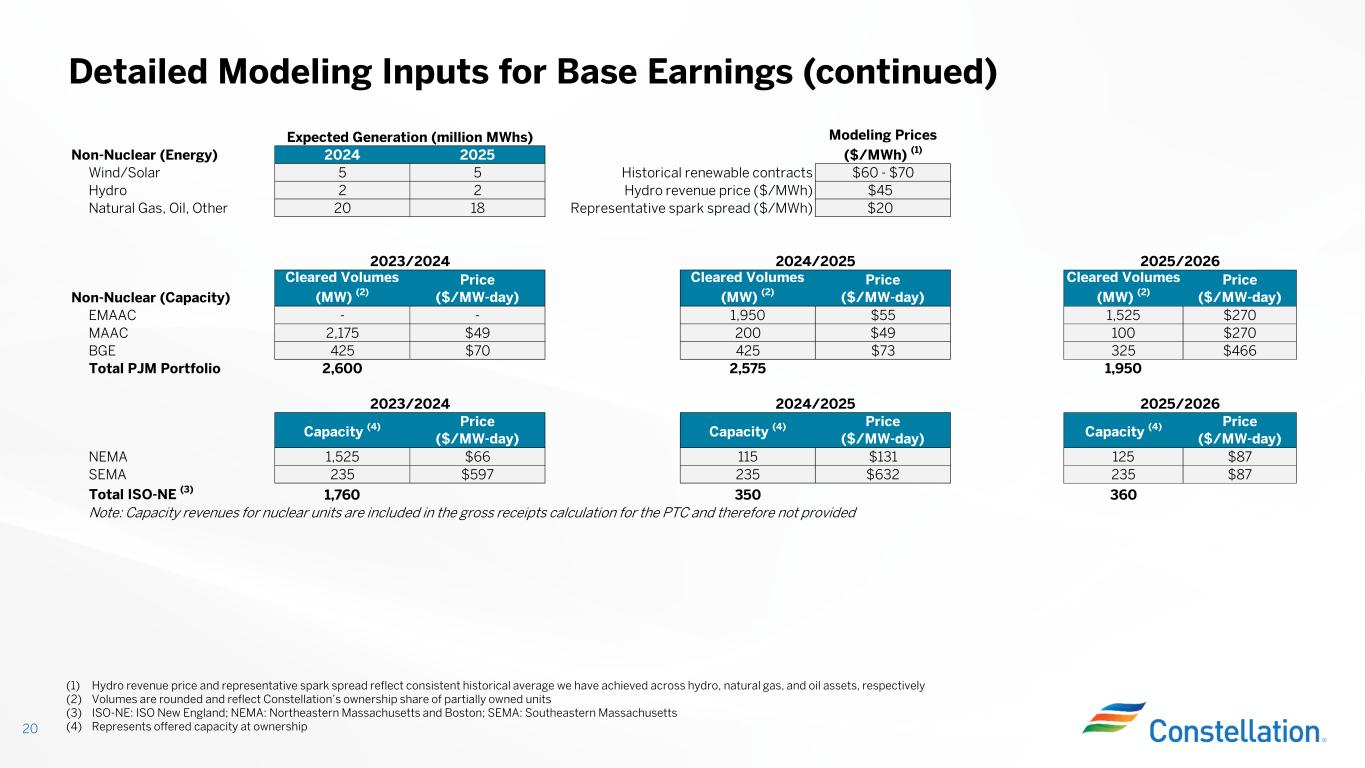 Detailed Modeling Inputs for Base Earnings 19 Note: Items may not sum due to rounding (1) Reflected at ownership; includes Salem and STP. Does not include expected generation from Crane. (2) Reflects calendar year price based on weighted average CMC prices across planning years (3) Values reflect the total of energy, capacity, and ZEC consistent with the rate-setting mechanism (4) 13-Year average represents eight years of historical realized margins and five years of forward-looking forecast Expected Generation (million MWhs) (1) Nuclear 2024 2025 2026 2027 2028 IL CMC Units 54 54 53 23 - NY Units 25 26 25 26 25 Remaining Units 102 102 102 132 159 Total Nuclear 181 183 180 181 184 Number of Planned Refueling Outages (1) 15 12 15 15 12 Price ($/MWh) 2024 2025 2026 2027 2028 IL CMC Units (2) $33.04 $33.47 $34.09 $34.50 NY Units (3) $60 - $61 $60 - $63 Remaining Units (2% Inflation) $43.75 $44.75 $44.75 $45.75 $45.75 Nuclear Fuel ($4.85 - $4.90) ($5.30 - $5.35) PTC Inflation Scenarios ($/MWh) 2024 2025 2026 2027 2028 2% Inflation $43.75 $44.75 $44.75 $45.75 $45.75 3% Inflation $43.75 $44.75 $45.75 $48.88 $49.88 4% Inflation $43.75 $44.75 $45.75 $49.88 $50.88 Volume Margins (13-Year Average) (4) Commercial (Retail/Wholesale) 2024 2025 2024 Power 200 million MWhs 205 million MWhs $3.50 - $3.60/MWh Gas 855 million dth 840 million dth $0.25 - $0.30/dth
