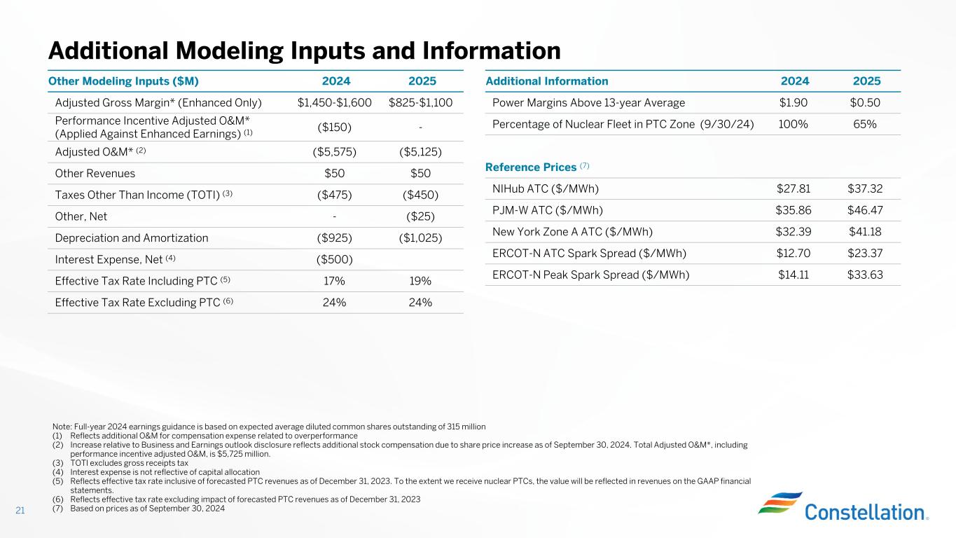 Detailed Modeling Inputs for Base Earnings (continued) 20 (1) Hydro revenue price and representative spark spread reflect consistent historical average we have achieved across hydro, natural gas, and oil assets, respectively (2) Volumes are rounded and reflect Constellation’s ownership share of partially owned units (3) ISO-NE: ISO New England; NEMA: Northeastern Massachusetts and Boston; SEMA: Southeastern Massachusetts (4) Represents offered capacity at ownership Expected Generation (million MWhs) Non-Nuclear (Energy) 2024 2025 Wind/Solar 5 5 Historical renewable contracts $60 - $70 Hydro 2 2 Hydro revenue price ($/MWh) $45 Natural Gas, Oil, Other 20 18 Representative spark spread ($/MWh) $20 2023/2024 2024/2025 2025/2026 Non-Nuclear (Capacity) Cleared Volumes (MW) (2) Price ($/MW-day) Cleared Volumes (MW) (2) Price ($/MW-day) Cleared Volumes (MW) (2) Price ($/MW-day) EMAAC - - 1,950 $55 1,525 $270 MAAC 2,175 $49 200 $49 100 $270 BGE 425 $70 425 $73 325 $466 Total PJM Portfolio 2,600 2,575 1,950 2023/2024 2024/2025 2025/2026 Capacity (4) Price ($/MW-day) Capacity (4) Price ($/MW-day) Capacity (4) Price ($/MW-day) NEMA 1,525 $66 115 $131 125 $87 SEMA 235 $597 235 $632 235 $87 Total ISO-NE (3) 1,760 350 360 Note: Capacity revenues for nuclear units are included in the gross receipts calculation for the PTC and therefore not provided Modeling Prices ($/MWh) (1)