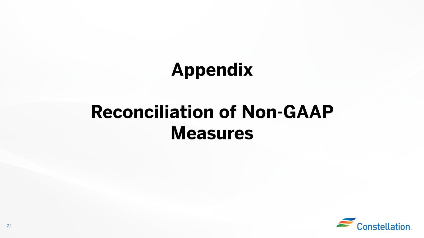 Additional Modeling Inputs and Information 21 Note: Full-year 2024 earnings guidance is based on expected average diluted common shares outstanding of 315 million (1) Reflects additional O&M for compensation expense related to overperformance (2) Increase relative to Business and Earnings outlook disclosure reflects additional stock compensation due to share price increase as of September 30, 2024. Total Adjusted O&M*, including performance incentive adjusted O&M, is $5,725 million. (3) TOTI excludes gross receipts tax (4) Interest expense is not reflective of capital allocation (5) Reflects effective tax rate inclusive of forecasted PTC revenues as of December 31, 2023. To the extent we receive nuclear PTCs, the value will be reflected in revenues on the GAAP financial statements. (6) Reflects effective tax rate excluding impact of forecasted PTC revenues as of December 31, 2023 (7) Based on prices as of September 30, 2024 20252024Other Modeling Inputs ($M) $825-$1,100$1,450-$1,600Adjusted Gross Margin* (Enhanced Only) -($150) Performance Incentive Adjusted O&M* (Applied Against Enhanced Earnings) (1) ($5,125)($5,575)Adjusted O&M* (2) $50$50Other Revenues ($450)($475)Taxes Other Than Income (TOTI) (3) ($25)-Other, Net ($1,025)($925)Depreciation and Amortization ($500)Interest Expense, Net (4) 19%17%Effective Tax Rate Including PTC (5) 24%24%Effective Tax Rate Excluding PTC (6) 20252024Additional Information $0.50$1.90Power Margins Above 13-year Average 65%100%Percentage of Nuclear Fleet in PTC Zone (9/30/24) Reference Prices (7) $37.32$27.81NIHub ATC ($/MWh) $46.47$35.86PJM-W ATC ($/MWh) $41.18$32.39New York Zone A ATC ($/MWh) $23.37$12.70ERCOT-N ATC Spark Spread ($/MWh) $33.63$14.11ERCOT-N Peak Spark Spread ($/MWh)