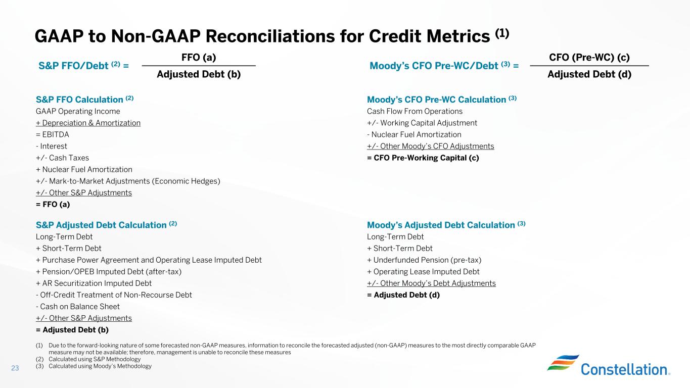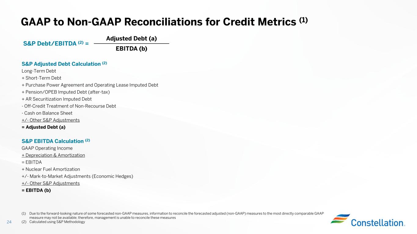 CFO (Pre-WC) (c) Moody’s CFO Pre-WC/Debt (3) = FFO (a) S&P FFO/Debt (2) = Adjusted Debt (d)Adjusted Debt (b) Moody’s CFO Pre-WC Calculation (3)S&P FFO Calculation (2) Cash Flow From OperationsGAAP Operating Income +/- Working Capital Adjustment+ Depreciation & Amortization - Nuclear Fuel Amortization= EBITDA +/- Other Moody’s CFO Adjustments- Interest = CFO Pre-Working Capital (c) +/- Cash Taxes + Nuclear Fuel Amortization +/- Mark-to-Market Adjustments (Economic Hedges) +/- Other S&P Adjustments = FFO (a) Moody’s Adjusted Debt Calculation (3)S&P Adjusted Debt Calculation (2) Long-Term DebtLong-Term Debt + Short-Term Debt+ Short-Term Debt + Underfunded Pension (pre-tax)+ Purchase Power Agreement and Operating Lease Imputed Debt + Operating Lease Imputed Debt+ Pension/OPEB Imputed Debt (after-tax) +/- Other Moody’s Debt Adjustments+ AR Securitization Imputed Debt = Adjusted Debt (d)- Off-Credit Treatment of Non-Recourse Debt - Cash on Balance Sheet +/- Other S&P Adjustments = Adjusted Debt (b) GAAP to Non-GAAP Reconciliations for Credit Metrics (1) 23 (1) Due to the forward-looking nature of some forecasted non-GAAP measures, information to reconcile the forecasted adjusted (non-GAAP) measures to the most directly comparable GAAP measure may not be available; therefore, management is unable to reconcile these measures (2) Calculated using S&P Methodology (3) Calculated using Moody’s Methodology
