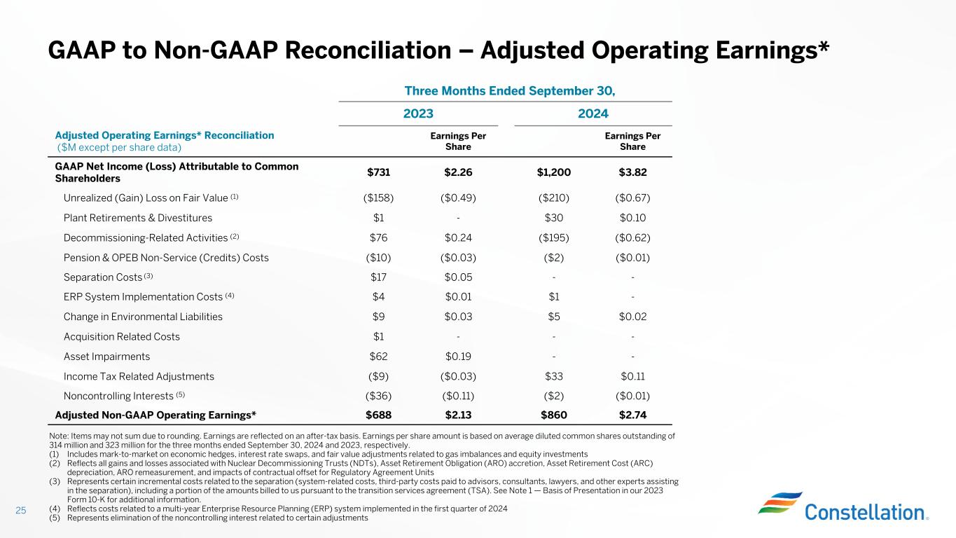 Adjusted Debt (a) S&P Debt/EBITDA (2) = EBITDA (b) S&P Adjusted Debt Calculation (2) Long-Term Debt + Short-Term Debt + Purchase Power Agreement and Operating Lease Imputed Debt + Pension/OPEB Imputed Debt (after-tax) + AR Securitization Imputed Debt - Off-Credit Treatment of Non-Recourse Debt - Cash on Balance Sheet +/- Other S&P Adjustments = Adjusted Debt (a) S&P EBITDA Calculation (2) GAAP Operating Income + Depreciation & Amortization = EBITDA + Nuclear Fuel Amortization +/- Mark-to-Market Adjustments (Economic Hedges) +/- Other S&P Adjustments = EBITDA (b) GAAP to Non-GAAP Reconciliations for Credit Metrics (1) 24 (1) Due to the forward-looking nature of some forecasted non-GAAP measures, information to reconcile the forecasted adjusted (non-GAAP) measures to the most directly comparable GAAP measure may not be available; therefore, management is unable to reconcile these measures (2) Calculated using S&P Methodology