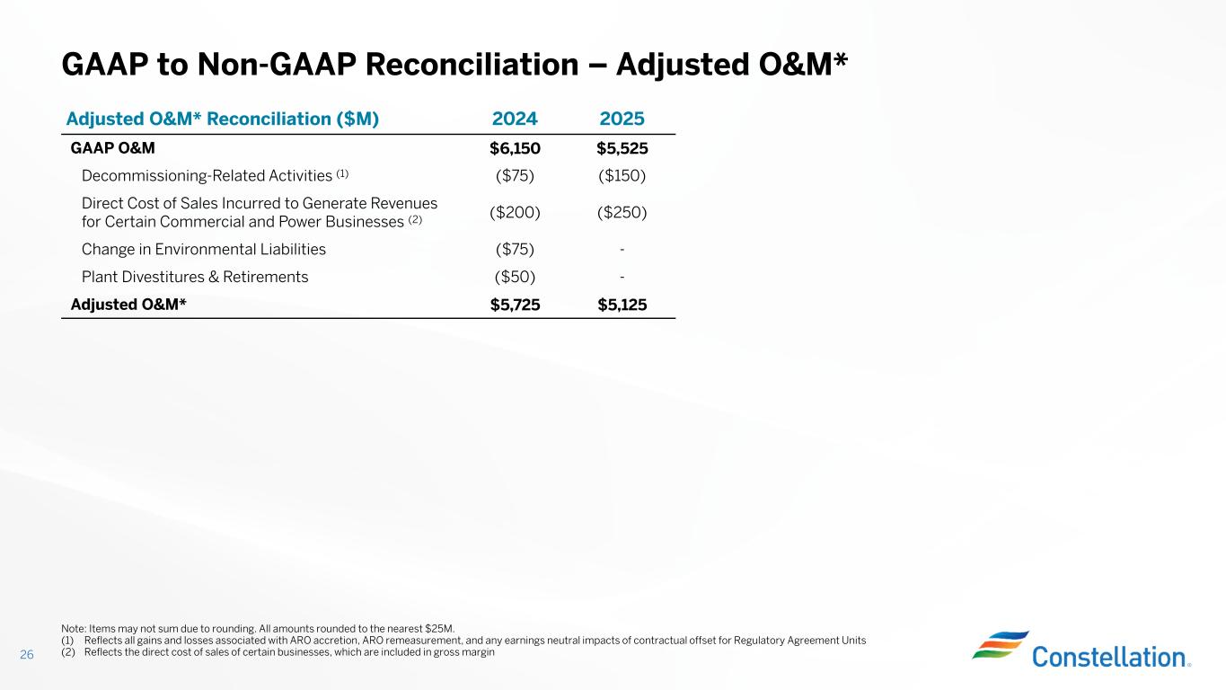 Three Months Ended September 30, 20242023 Earnings Per Share Earnings Per Share Adjusted Operating Earnings* Reconciliation ($M except per share data) $3.82$1,200$2.26$731 GAAP Net Income (Loss) Attributable to Common Shareholders ($0.67)($210)($0.49)($158)Unrealized (Gain) Loss on Fair Value (1) $0.10$30-$1Plant Retirements & Divestitures ($0.62)($195)$0.24$76Decommissioning-Related Activities (2) ($0.01)($2)($0.03)($10)Pension & OPEB Non-Service (Credits) Costs --$0.05$17Separation Costs (3) -$1$0.01$4ERP System Implementation Costs (4) $0.02$5$0.03$9Change in Environmental Liabilities ---$1Acquisition Related Costs --$0.19$62Asset Impairments $0.11$33($0.03)($9)Income Tax Related Adjustments ($0.01)($2)($0.11)($36)Noncontrolling Interests (5) $2.74$860$2.13$688Adjusted Non-GAAP Operating Earnings* GAAP to Non-GAAP Reconciliation – Adjusted Operating Earnings* 25 Note: Items may not sum due to rounding. Earnings are reflected on an after-tax basis. Earnings per share amount is based on average diluted common shares outstanding of 314 million and 323 million for the three months ended September 30, 2024 and 2023, respectively. (1) Includes mark-to-market on economic hedges, interest rate swaps, and fair value adjustments related to gas imbalances and equity investments (2) Reflects all gains and losses associated with Nuclear Decommissioning Trusts (NDTs), Asset Retirement Obligation (ARO) accretion, Asset Retirement Cost (ARC) depreciation, ARO remeasurement, and impacts of contractual offset for Regulatory Agreement Units (3) Represents certain incremental costs related to the separation (system-related costs, third-party costs paid to advisors, consultants, lawyers, and other experts assisting in the separation), including a portion of the amounts billed to us pursuant to the transition services agreement (TSA). See Note 1 — Basis of Presentation in our 2023 Form 10-K for additional information. (4) Reflects costs related to a multi-year Enterprise Resource Planning (ERP) system implemented in the first quarter of 2024 (5) Represents elimination of the noncontrolling interest related to certain adjustments
