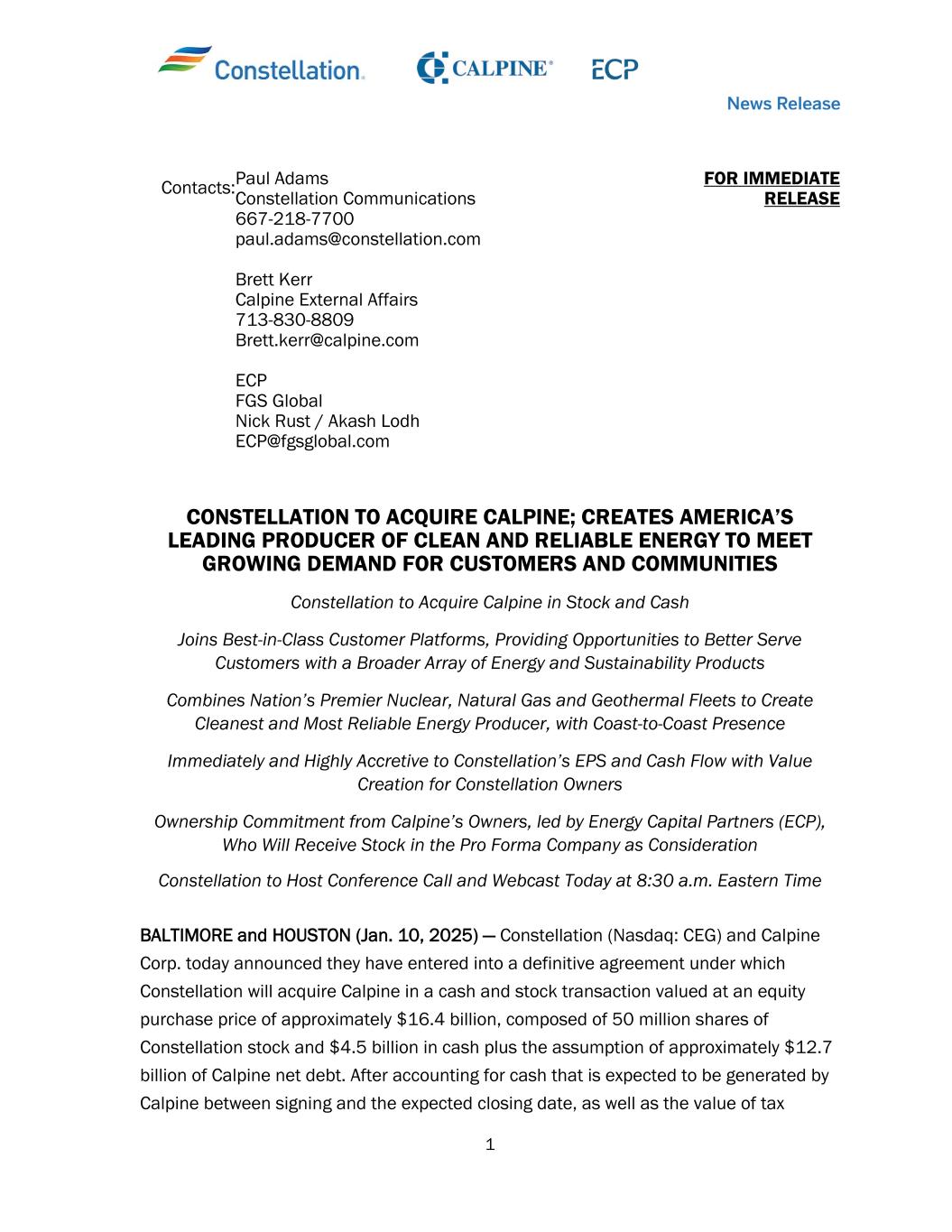 1 Contacts: Paul Adams Constellation Communications 667-218-7700 paul.adams@constellation.com Brett Kerr Calpine External Affairs 713-830-8809 Brett.kerr@calpine.com ECP FGS Global Nick Rust / Akash Lodh ECP@fgsglobal.com FOR IMMEDIATE RELEASE CONSTELLATION TO ACQUIRE CALPINE; CREATES AMERICA’S LEADING PRODUCER OF CLEAN AND RELIABLE ENERGY TO MEET GROWING DEMAND FOR CUSTOMERS AND COMMUNITIES Constellation to Acquire Calpine in Stock and Cash Joins Best-in-Class Customer Platforms, Providing Opportunities to Better Serve Customers with a Broader Array of Energy and Sustainability Products Combines Nation’s Premier Nuclear, Natural Gas and Geothermal Fleets to Create Cleanest and Most Reliable Energy Producer, with Coast-to-Coast Presence Immediately and Highly Accretive to Constellation’s EPS and Cash Flow with Value Creation for Constellation Owners Ownership Commitment from Calpine’s Owners, led by Energy Capital Partners (ECP), Who Will Receive Stock in the Pro Forma Company as Consideration Constellation to Host Conference Call and Webcast Today at 8:30 a.m. Eastern Time BALTIMORE and HOUSTON (Jan. 10, 2025) — Constellation (Nasdaq: CEG) and Calpine Corp. today announced they have entered into a definitive agreement under which Constellation will acquire Calpine in a cash and stock transaction valued at an equity purchase price of approximately $16.4 billion, composed of 50 million shares of Constellation stock and $4.5 billion in cash plus the assumption of approximately $12.7 billion of Calpine net debt. After accounting for cash that is expected to be generated by Calpine between signing and the expected closing date, as well as the value of tax
