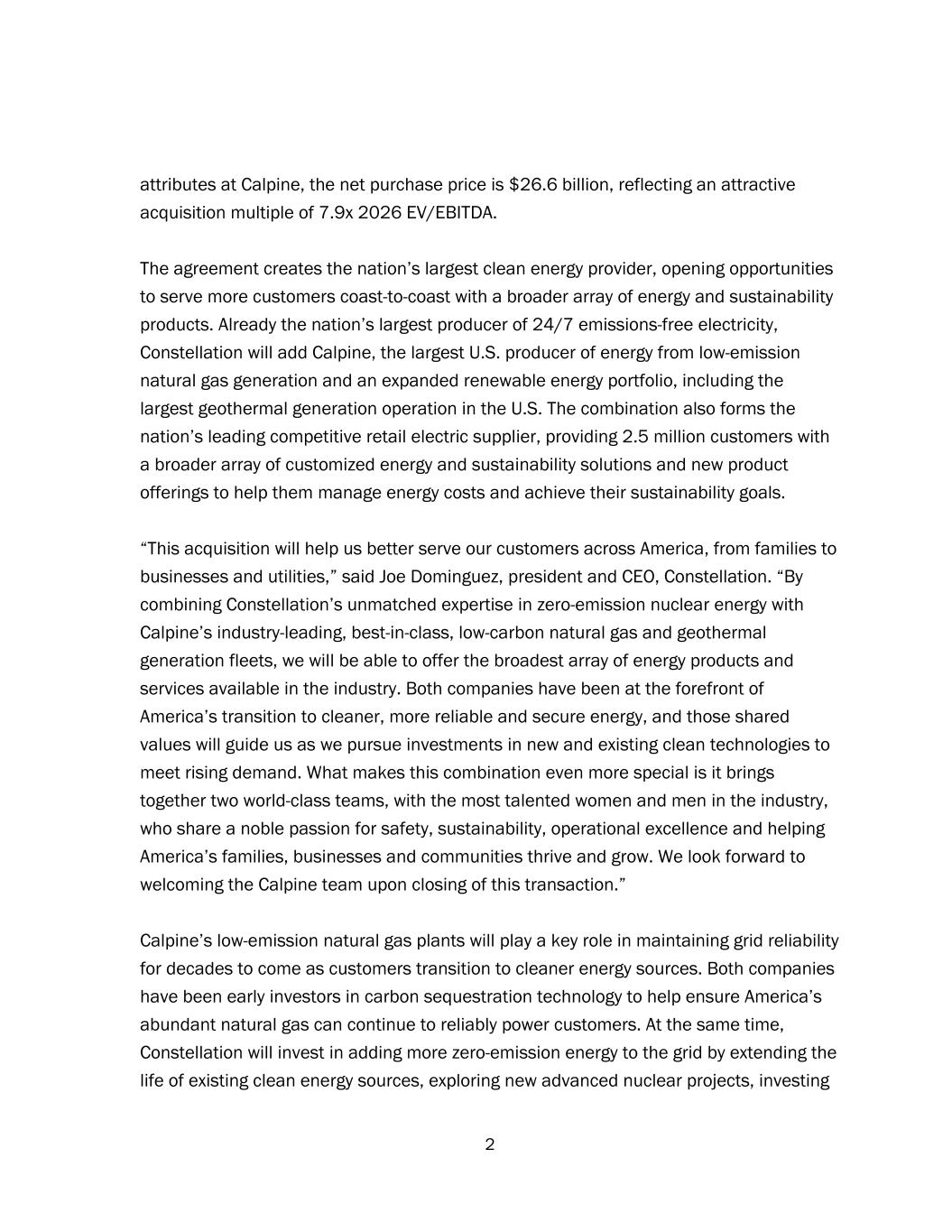 2 attributes at Calpine, the net purchase price is $26.6 billion, reflecting an attractive acquisition multiple of 7.9x 2026 EV/EBITDA. The agreement creates the nation’s largest clean energy provider, opening opportunities to serve more customers coast-to-coast with a broader array of energy and sustainability products. Already the nation’s largest producer of 24/7 emissions-free electricity, Constellation will add Calpine, the largest U.S. producer of energy from low-emission natural gas generation and an expanded renewable energy portfolio, including the largest geothermal generation operation in the U.S. The combination also forms the nation’s leading competitive retail electric supplier, providing 2.5 million customers with a broader array of customized energy and sustainability solutions and new product offerings to help them manage energy costs and achieve their sustainability goals. “This acquisition will help us better serve our customers across America, from families to businesses and utilities,” said Joe Dominguez, president and CEO, Constellation. “By combining Constellation’s unmatched expertise in zero-emission nuclear energy with Calpine’s industry-leading, best-in-class, low-carbon natural gas and geothermal generation fleets, we will be able to offer the broadest array of energy products and services available in the industry. Both companies have been at the forefront of America’s transition to cleaner, more reliable and secure energy, and those shared values will guide us as we pursue investments in new and existing clean technologies to meet rising demand. What makes this combination even more special is it brings together two world-class teams, with the most talented women and men in the industry, who share a noble passion for safety, sustainability, operational excellence and helping America’s families, businesses and communities thrive and grow. We look forward to welcoming the Calpine team upon closing of this transaction.” Calpine’s low-emission natural gas plants will play a key role in maintaining grid reliability for decades to come as customers transition to cleaner energy sources. Both companies have been early investors in carbon sequestration technology to help ensure America’s abundant natural gas can continue to reliably power customers. At the same time, Constellation will invest in adding more zero-emission energy to the grid by extending the life of existing clean energy sources, exploring new advanced nuclear projects, investing