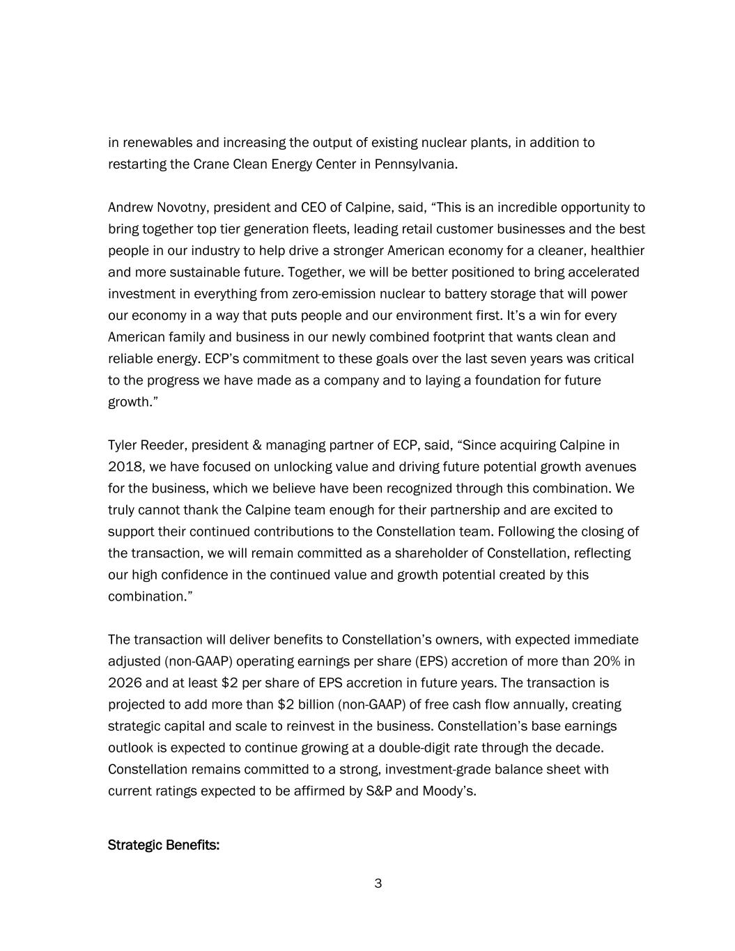 3 in renewables and increasing the output of existing nuclear plants, in addition to restarting the Crane Clean Energy Center in Pennsylvania. Andrew Novotny, president and CEO of Calpine, said, “This is an incredible opportunity to bring together top tier generation fleets, leading retail customer businesses and the best people in our industry to help drive a stronger American economy for a cleaner, healthier and more sustainable future. Together, we will be better positioned to bring accelerated investment in everything from zero-emission nuclear to battery storage that will power our economy in a way that puts people and our environment first. It’s a win for every American family and business in our newly combined footprint that wants clean and reliable energy. ECP’s commitment to these goals over the last seven years was critical to the progress we have made as a company and to laying a foundation for future growth.” Tyler Reeder, president & managing partner of ECP, said, “Since acquiring Calpine in 2018, we have focused on unlocking value and driving future potential growth avenues for the business, which we believe have been recognized through this combination. We truly cannot thank the Calpine team enough for their partnership and are excited to support their continued contributions to the Constellation team. Following the closing of the transaction, we will remain committed as a shareholder of Constellation, reflecting our high confidence in the continued value and growth potential created by this combination.” The transaction will deliver benefits to Constellation’s owners, with expected immediate adjusted (non-GAAP) operating earnings per share (EPS) accretion of more than 20% in 2026 and at least $2 per share of EPS accretion in future years. The transaction is projected to add more than $2 billion (non-GAAP) of free cash flow annually, creating strategic capital and scale to reinvest in the business. Constellation’s base earnings outlook is expected to continue growing at a double-digit rate through the decade. Constellation remains committed to a strong, investment-grade balance sheet with current ratings expected to be affirmed by S&P and Moody’s. Strategic Benefits: