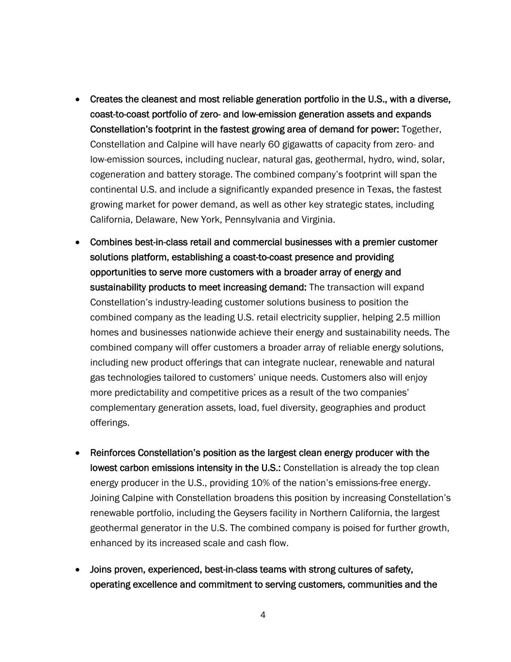 4 • Creates the cleanest and most reliable generation portfolio in the U.S., with a diverse, coast-to-coast portfolio of zero- and low-emission generation assets and expands Constellation’s footprint in the fastest growing area of demand for power: Together, Constellation and Calpine will have nearly 60 gigawatts of capacity from zero- and low-emission sources, including nuclear, natural gas, geothermal, hydro, wind, solar, cogeneration and battery storage. The combined company’s footprint will span the continental U.S. and include a significantly expanded presence in Texas, the fastest growing market for power demand, as well as other key strategic states, including California, Delaware, New York, Pennsylvania and Virginia. • Combines best-in-class retail and commercial businesses with a premier customer solutions platform, establishing a coast-to-coast presence and providing opportunities to serve more customers with a broader array of energy and sustainability products to meet increasing demand: The transaction will expand Constellation’s industry-leading customer solutions business to position the combined company as the leading U.S. retail electricity supplier, helping 2.5 million homes and businesses nationwide achieve their energy and sustainability needs. The combined company will offer customers a broader array of reliable energy solutions, including new product offerings that can integrate nuclear, renewable and natural gas technologies tailored to customers’ unique needs. Customers also will enjoy more predictability and competitive prices as a result of the two companies’ complementary generation assets, load, fuel diversity, geographies and product offerings. • Reinforces Constellation’s position as the largest clean energy producer with the lowest carbon emissions intensity in the U.S.: Constellation is already the top clean energy producer in the U.S., providing 10% of the nation’s emissions-free energy. Joining Calpine with Constellation broadens this position by increasing Constellation’s renewable portfolio, including the Geysers facility in Northern California, the largest geothermal generator in the U.S. The combined company is poised for further growth, enhanced by its increased scale and cash flow. • Joins proven, experienced, best-in-class teams with strong cultures of safety, operating excellence and commitment to serving customers, communities and the
