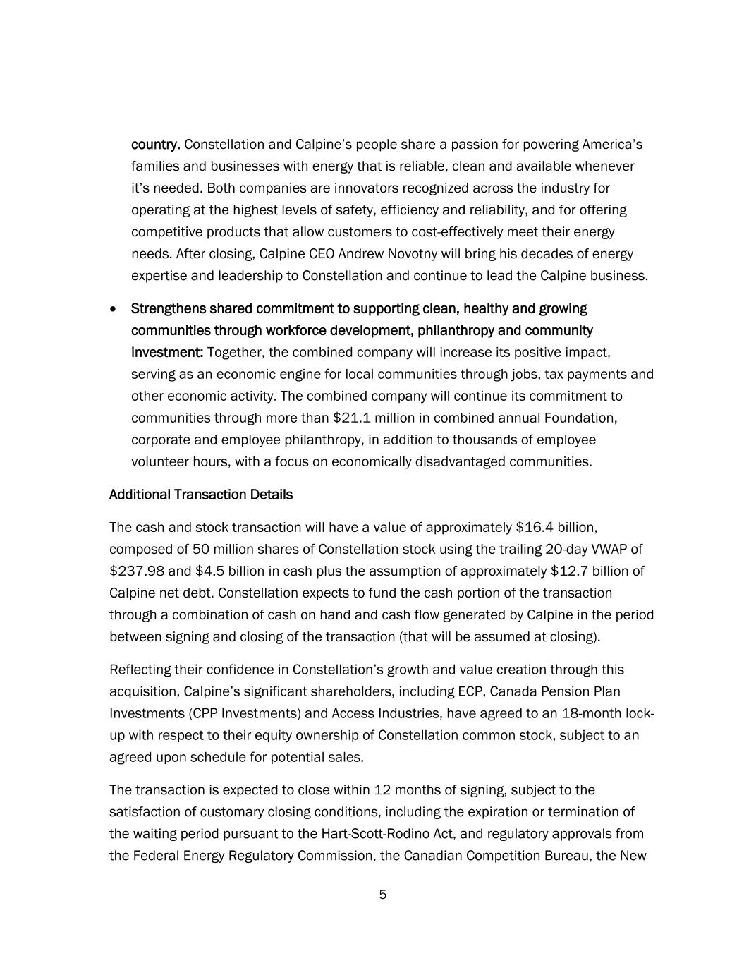 5 country. Constellation and Calpine’s people share a passion for powering America’s families and businesses with energy that is reliable, clean and available whenever it’s needed. Both companies are innovators recognized across the industry for operating at the highest levels of safety, efficiency and reliability, and for offering competitive products that allow customers to cost-effectively meet their energy needs. After closing, Calpine CEO Andrew Novotny will bring his decades of energy expertise and leadership to Constellation and continue to lead the Calpine business. • Strengthens shared commitment to supporting clean, healthy and growing communities through workforce development, philanthropy and community investment: Together, the combined company will increase its positive impact, serving as an economic engine for local communities through jobs, tax payments and other economic activity. The combined company will continue its commitment to communities through more than $21.1 million in combined annual Foundation, corporate and employee philanthropy, in addition to thousands of employee volunteer hours, with a focus on economically disadvantaged communities. Additional Transaction Details The cash and stock transaction will have a value of approximately $16.4 billion, composed of 50 million shares of Constellation stock using the trailing 20-day VWAP of $237.98 and $4.5 billion in cash plus the assumption of approximately $12.7 billion of Calpine net debt. Constellation expects to fund the cash portion of the transaction through a combination of cash on hand and cash flow generated by Calpine in the period between signing and closing of the transaction (that will be assumed at closing). Reflecting their confidence in Constellation’s growth and value creation through this acquisition, Calpine’s significant shareholders, including ECP, Canada Pension Plan Investments (CPP Investments) and Access Industries, have agreed to an 18-month lock- up with respect to their equity ownership of Constellation common stock, subject to an agreed upon schedule for potential sales. The transaction is expected to close within 12 months of signing, subject to the satisfaction of customary closing conditions, including the expiration or termination of the waiting period pursuant to the Hart-Scott-Rodino Act, and regulatory approvals from the Federal Energy Regulatory Commission, the Canadian Competition Bureau, the New