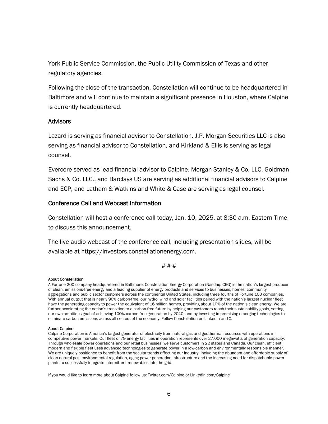 6 York Public Service Commission, the Public Utility Commission of Texas and other regulatory agencies. Following the close of the transaction, Constellation will continue to be headquartered in Baltimore and will continue to maintain a significant presence in Houston, where Calpine is currently headquartered. Advisors Lazard is serving as financial advisor to Constellation. J.P. Morgan Securities LLC is also serving as financial advisor to Constellation, and Kirkland & Ellis is serving as legal counsel. Evercore served as lead financial advisor to Calpine. Morgan Stanley & Co. LLC, Goldman Sachs & Co. LLC., and Barclays US are serving as additional financial advisors to Calpine and ECP, and Latham & Watkins and White & Case are serving as legal counsel. Conference Call and Webcast Information Constellation will host a conference call today, Jan. 10, 2025, at 8:30 a.m. Eastern Time to discuss this announcement. The live audio webcast of the conference call, including presentation slides, will be available at https://investors.constellationenergy.com. # # # About Constellation A Fortune 200 company headquartered in Baltimore, Constellation Energy Corporation (Nasdaq: CEG) is the nation’s largest producer of clean, emissions-free energy and a leading supplier of energy products and services to businesses, homes, community aggregations and public sector customers across the continental United States, including three fourths of Fortune 100 companies. With annual output that is nearly 90% carbon-free, our hydro, wind and solar facilities paired with the nation’s largest nuclear fleet have the generating capacity to power the equivalent of 16 million homes, providing about 10% of the nation’s clean energy. We are further accelerating the nation’s transition to a carbon-free future by helping our customers reach their sustainability goals, setting our own ambitious goal of achieving 100% carbon-free generation by 2040, and by investing in promising emerging technologies to eliminate carbon emissions across all sectors of the economy. Follow Constellation on LinkedIn and X. About Calpine Calpine Corporation is America’s largest generator of electricity from natural gas and geothermal resources with operations in competitive power markets. Our fleet of 79 energy facilities in operation represents over 27,000 megawatts of generation capacity. Through wholesale power operations and our retail businesses, we serve customers in 22 states and Canada. Our clean, efficient, modern and flexible fleet uses advanced technologies to generate power in a low-carbon and environmentally responsible manner. We are uniquely positioned to benefit from the secular trends affecting our industry, including the abundant and affordable supply of clean natural gas, environmental regulation, aging power generation infrastructure and the increasing need for dispatchable power plants to successfully integrate intermittent renewables into the grid. If you would like to learn more about Calpine follow us: Twitter.com/Calpine or Linkedin.com/Calpine