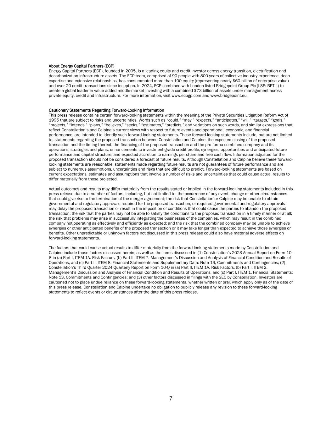 7 About Energy Capital Partners (ECP) Energy Capital Partners (ECP), founded in 2005, is a leading equity and credit investor across energy transition, electrification and decarbonization infrastructure assets. The ECP team, comprised of 90 people with 800 years of collective industry experience, deep expertise and extensive relationships, has consummated more than 100 equity (representing nearly $60 billion of enterprise value) and over 20 credit transactions since inception. In 2024, ECP combined with London listed Bridgepoint Group Plc (LSE: BPT.L) to create a global leader in value added middle-market investing with a combined $73 billion of assets under management across private equity, credit and infrastructure. For more information, visit www.ecpgp.com and www.bridgepoint.eu. Cautionary Statements Regarding Forward-Looking Information This press release contains certain forward-looking statements within the meaning of the Private Securities Litigation Reform Act of 1995 that are subject to risks and uncertainties. Words such as “could,” “may,” “expects,” “anticipates,” “will,” “targets,” “goals,” “projects,” “intends,” “plans,” “believes,” “seeks,” “estimates,” “predicts,” and variations on such words, and similar expressions that reflect Constellation’s and Calpine’s current views with respect to future events and operational, economic, and financial performance, are intended to identify such forward-looking statements. These forward-looking statements include, but are not limited to, statements regarding the proposed transaction between Constellation and Calpine, the expected closing of the proposed transaction and the timing thereof, the financing of the proposed transaction and the pro forma combined company and its operations, strategies and plans, enhancements to investment-grade credit profile, synergies, opportunities and anticipated future performance and capital structure, and expected accretion to earnings per share and free cash flow. Information adjusted for the proposed transaction should not be considered a forecast of future results. Although Constellation and Calpine believe these forward- looking statements are reasonable, statements made regarding future results are not guarantees of future performance and are subject to numerous assumptions, uncertainties and risks that are difficult to predict. Forward-looking statements are based on current expectations, estimates and assumptions that involve a number of risks and uncertainties that could cause actual results to differ materially from those projected. Actual outcomes and results may differ materially from the results stated or implied in the forward-looking statements included in this press release due to a number of factors, including, but not limited to: the occurrence of any event, change or other circumstances that could give rise to the termination of the merger agreement; the risk that Constellation or Calpine may be unable to obtain governmental and regulatory approvals required for the proposed transaction, or required governmental and regulatory approvals may delay the proposed transaction or result in the imposition of conditions that could cause the parties to abandon the proposed transaction; the risk that the parties may not be able to satisfy the conditions to the proposed transaction in a timely manner or at all; the risk that problems may arise in successfully integrating the businesses of the companies, which may result in the combined company not operating as effectively and efficiently as expected; and the risk that the combined company may be unable to achieve synergies or other anticipated benefits of the proposed transaction or it may take longer than expected to achieve those synergies or benefits. Other unpredictable or unknown factors not discussed in this press release could also have material adverse effects on forward-looking statements. The factors that could cause actual results to differ materially from the forward-looking statements made by Constellation and Calpine include those factors discussed herein, as well as the items discussed in (1) Constellation’s 2023 Annual Report on Form 10- K in (a) Part I, ITEM 1A. Risk Factors, (b) Part II, ITEM 7. Management’s Discussion and Analysis of Financial Condition and Results of Operations, and (c) Part II, ITEM 8. Financial Statements and Supplementary Data: Note 19, Commitments and Contingencies; (2) Constellation’s Third Quarter 2024 Quarterly Report on Form 10-Q in (a) Part II, ITEM 1A. Risk Factors, (b) Part I, ITEM 2. Management’s Discussion and Analysis of Financial Condition and Results of Operations, and (c) Part I, ITEM 1. Financial Statements: Note 13, Commitments and Contingencies; and (3) other factors discussed in filings with the SEC by Constellation. Investors are cautioned not to place undue reliance on these forward-looking statements, whether written or oral, which apply only as of the date of this press release. Constellation and Calpine undertake no obligation to publicly release any revision to these forward-looking statements to reflect events or circumstances after the date of this press release.